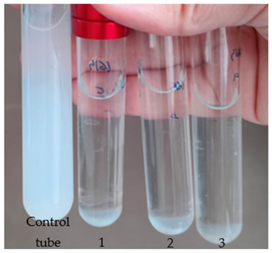 Representative result of the DLN biodegradation assay. The control tube was inoculated with sterile water, while tubes 1, 2, and 3 (triplicate) were inoculated with a bacterial isolate and incubated for four days.