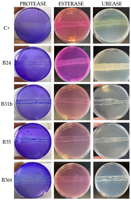 On the other hand, esterase activity was evaluated using the method described by Sierra (1957) [32]. Strains were subcultured on Tween 80 agar (composition in g/L: peptone, 10; NaCl, 5; CaCl2, 0.1; agar, 12; and supplemented with Tween 80, 10 mL/L) and incubated at 37 °C for 120 h. Esterase-positive strains showed a white precipitate halo surrounding the colonies due to calcium salt formation. Pseudomonas aeruginosa was used as a positive control for all three enzymatic assays, as it is known to express protease, urease, and esterase activities, hereby serving as a reliable reference strain for experimental validation.