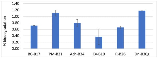 FPU biodegradation (%) obtained with selected isolates: Bc-17, Bacillus cereus, isolate B17; Pm, Priestia megaterium, isolate B21; Ach-B34, Achromobacter sp., isolate B34; Cv-B10, Cupriavidus sp., isolate B10; R-B26, Rhodococcus erythropolis, isolate B26; and Dn-30g, Dermacoccus nishinomiyaensis, isolate B30g.