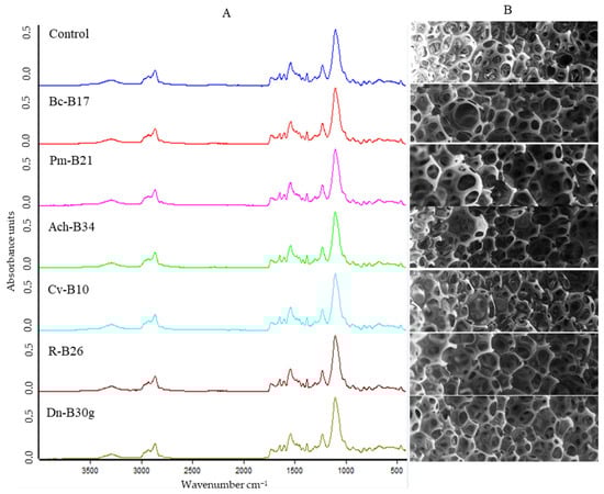Characterization of FPU biodegradation. (A) FTIR spectra of FPU incubated without bacteria (control) and with selected isolates for FPU biodegradation: Bc-17, Bacillus cereus, isolate B17; Pm, Priestia megaterium, isolate B21; Ach-B34, Achromobacter sp., isolate B34; Cv-B10, Cupriavidus sp., isolate B10; R-B26, Rhodococcus erythropolis, isolate B26; and Dn-B30g, Dermacoccus nishinomiyaensis, isolate B30g. (B) SEM images at 25× magnification of FPU after biodegradation essay with the same isolates.
