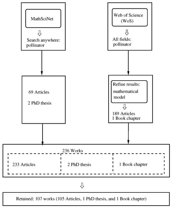 We performed an examination of the 236 works and retained those which were related, namely with mathematical modeling as the topic of the paper, obtaining a list of 107 works [10,11,12,13,14,15,16,17,18,19,20,21,22,23,24,25,26,27,28,29,30,31,32,33,34,35,36,37,38,39,40,41,42,43,44,45,46,47,48,49,50,51,52,53,54,55,56,57,58,59,60,61,62,63,64,65,66,67,68,69,70,71,72,73,74,75,76,77,78,79,80,81,82,83,84,85,86,87,88,89,90,91,92,93,94,95,96,97,98,99,100,101,102,103,104,105,106,107,108,109,110,111,112,113,114,115,116]. In [19], there is a book chapter in conference proceedings, while [31] is a PhD thesis, and the other works are journal articles. We note two additional facts: the present review is registered in OSF (https://doi.org/10.17605/OSF.IO/3DWSR, accessed on 5 September 2025)), and for the inclusion criteria, we considered a work to be about mathematical modeling of pollinators when there was a proposal to research the population dynamics of pollinators.