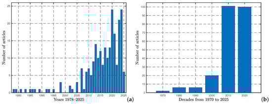 Number of works in MathSciNet and the WoS related to the keywords “pollinators” and “mathematical models”. (a) Number of articles by year from 1978 to 2025. (b) Number of articles by decade.