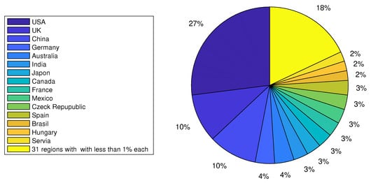 A graphical distribution of the list, by year and by decade from 1978 to 2025, is shown in Figure 2. Here, we observe that the oldest reference was from 1978, and the most recent one was from 2025. Also, we noticed a clear increase in articles over the decades, even though there were slight decreases in some years. Additionally, we also noted the geographic location declared by each of the authors in the corresponding affiliation for each article; the results are graphically presented in Figure 3. The affiliations of the authors were counted in the 236 works. The details for the retained list are given in Appendix A and more specifically in Table A1. The regions with the highest number of records were the United States of America (USA), the United Kingdom (UK), and China, with 205, 102, and 100 records, corresponding to 27%, 10%, and 10% of the works, respectively. These rankings were followed by regions with less than 4% representation as detailed below: