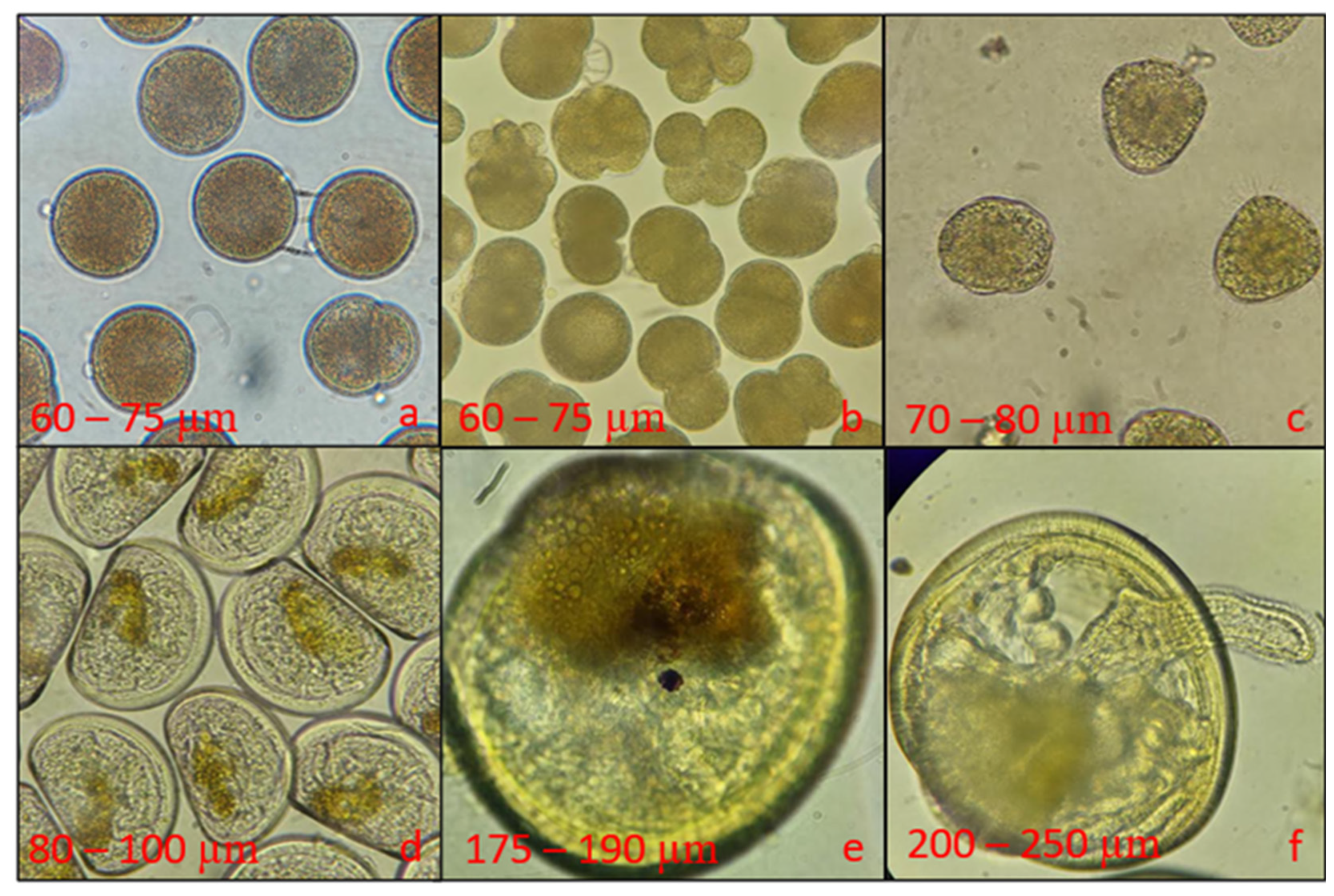 - Lago, A.; Basuyaux, Y.; Leira, M.; Costas, D.; Paredes, E. Influence of physico-chemical parameters on the settlement of competent larvae of cultured sea urchin, Paracentrotus lividus. Aquaculture 2024, 589, 740982. [Google Scholar] [CrossRef]