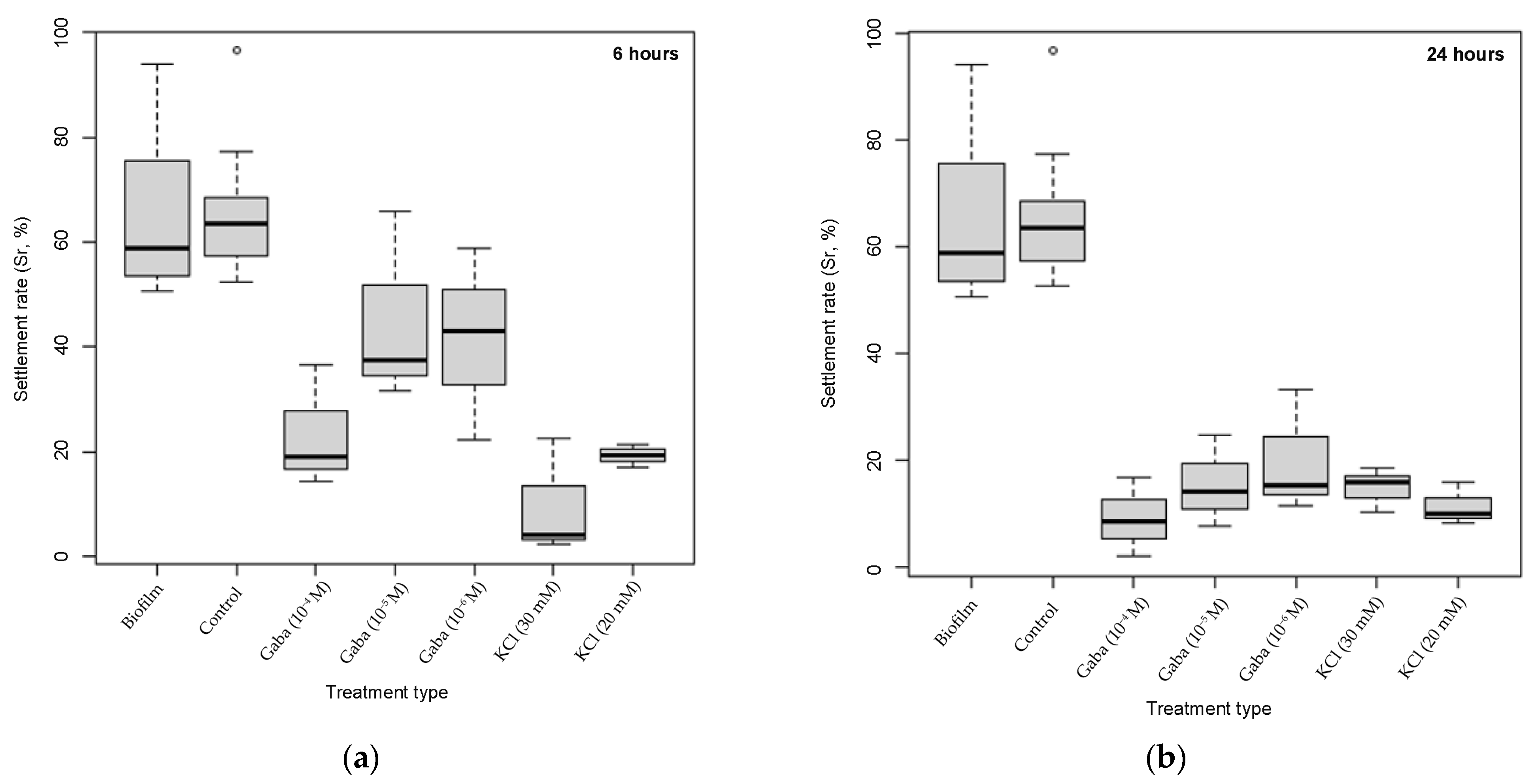- Morse, D.E.; Hooker, N.; Duncan, H.; Jensen, L. γ-Aminobutyric Acid, a Neurotransmitter, Induces Planktonic Abalone Larvae to Settle and Begin Metamorphosis. Science 1979, 204, 407–410. [Google Scholar] [CrossRef]