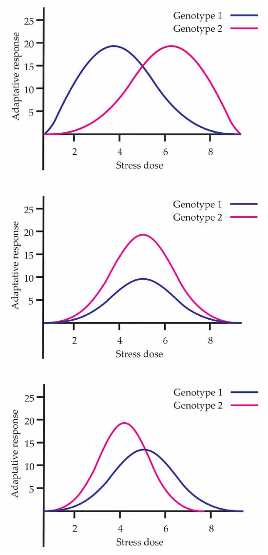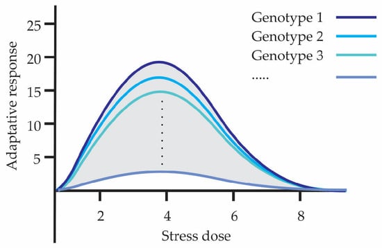 Hormesis is part of and is a consequence of genetic variability that gives rise to physiological variability; both influence the organism and certain responses are favored or not as a consequence of environmental conditions. Hormesis management, through the type of stress, dose, and exposure, reveals the adaptive capacity that individuals possess, making visible the variability expressed in them. Individuals in a population may show greater or lesser hormetic capacity and as a whole explore a broader range of adaptive strategies, increasing their survival and evolutionary success under changing environmental conditions over time. Hormesis allows exposing existing variability, being the process for generating the raw material upon which natural selection acts. Figure 3 shows how phenotypic variability can manifest in different hormetic curves. Each curve corresponds to a different genotype indicating that different individuals or genetic variants can exhibit distinct hormetic responses to the same level of stress. It shows that both the adaptive capacity and the optimal stress range vary according to genetic variability.