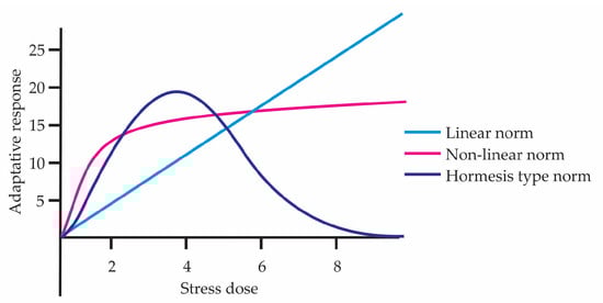 According to Stearns [40], the relationship between evolution and reaction norm can be expressed in three forms of phenotypic plasticity: non-adaptive, where phenotypic change occurs but does not improve survival; maladaptive, where the plastic response decreases fitness; and adaptive, where the criterion for recognizing an adaptation is that the phenotypic change responds to a specific environmental signal and that there exists a clear functional relationship with that signal. In the hormetic curve, the beneficial response at low doses fits with what Stearns would call adaptive plasticity, whereas at high doses there is damage or a maladaptive response. At the beginning of the 2000s, Massimo Pigliucci [41], just like Stearns, revisited the concept of reaction norms, represented as an environment–phenotype graph, where the environmental parameter is placed on the abscissa and a measure of the phenotype on the ordinate. They can take more complex forms, for example polynomial functions [42,43]. In this sense, a hormetic dose–response curve constitutes an example of a nonlinear reaction norm (Figure 5). The graph compares three forms of reaction norms across different stress doses, showing how the adaptive response can vary depending on the biological model. Pigliucci [41] also points out that plasticity connects genotype, environment, and phenotype through epigenetic mechanisms, enabling adaptive adjustments that enhance the organism’s resilience—an effect to which hormetic phenomena contribute directly. He also explains the importance of an organism not canalizing its adaptive responses to a single environment but rather maintaining the capacity to survive and function in different types of environments, offering an evolutionary advantage by enhancing survival and resilience to stress.