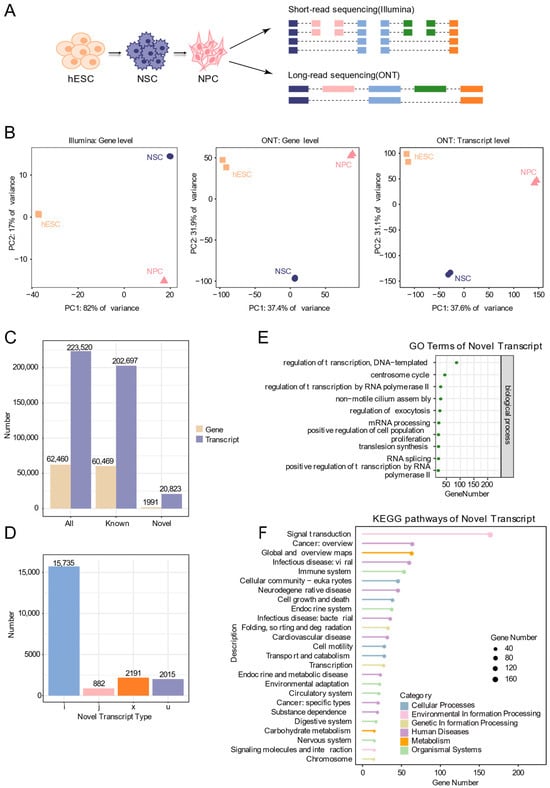 Identification of novel transcripts by ONT long-read sequencing. (A) Schematic plot of short-read and ONT sequencing during neural differentiation of human embryonic stem cells. (B) Principal component analysis based on gene expression and transcript expression. (C) Bar chart showing the number of known and novel genes and transcripts identified from ONT data. (D) Bar chart showing the types and numbers of new transcripts. Categories include: i, transcripts fully contained within introns of reference transcripts; j, transcripts with at least one matching exon; x, antisense transcripts overlapping exons of annotated genes; u, unannotated novel transcripts. (E) GO functional annotation of new transcripts. (F) KEGG pathway annotation of new transcripts.
