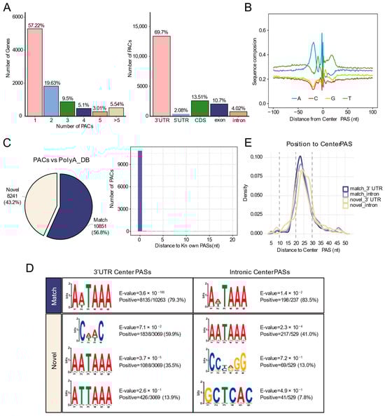 To validate the identified PACs, we examined the nucleotide composition surrounding the center PAS, which showed high similarity to reference PAS patterns (Figure 3B). Comparison with annotated sites in the PolyA_DB database revealed that 10,851 PACs perfectly matched known sites (distance = 0 nucleotides), while 8241 PACs were novel (Figure 3C). PASs are determined by the hexamer polyadenylation signal (AATAAA and its variants) and flanking regulatory elements. Motif enrichment analysis within 50 nt upstream of the center PASs showed that the canonical AATAAA signal was highly enriched in known PASs (79.3% in 3′ UTRs; 83.5% in introns). In contrast, novel 3′ UTR PASs exhibited distinct features: in addition to the AATAAA motif and its variants (AATAAA: 35.5%; ATTAAA: 13.9%), a novel motif, CAAC, was identified in 59.9%. Novel intronic PASs contained 41.0% AATAAA, as well as other motifs (13.0% CCTAGG; 7.8% GCTCAC) (Figure 3D). Density distribution analysis confirmed the expected position of AATAAA 20–30 nt upstream of the PASs (Figure 3E).