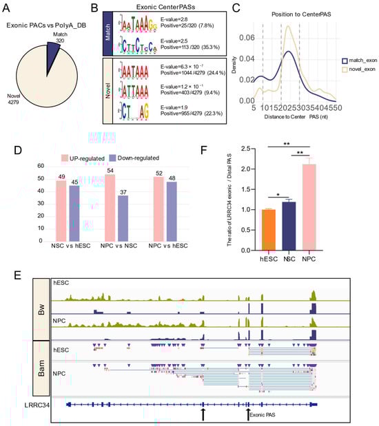 We next examined the dynamic usage of exonic PASs during differentiation. Compared with hESCs, NSCs showed 49 upregulated and 45 downregulated exonic PASs; compared with NSCs, NPCs had 54 upregulated and 37 downregulated PASs; and compared with hESCs, NPCs exhibited 52 upregulated and 48 downregulated PASs (Figure 6D). Visualization of representative genes in IGV revealed a gradual decrease in read coverage within exons, accompanied by an increase in truncated transcripts terminating at exonic PASs (Figure 6E). For LRRC34, RT-qPCR confirmed a significantly increased exonic PAS/distal PAS usage ratio at the NPC stage (Figure 6F), indicating a preferential switch from the distal 3′ UTR PAS to the exonic PAS.