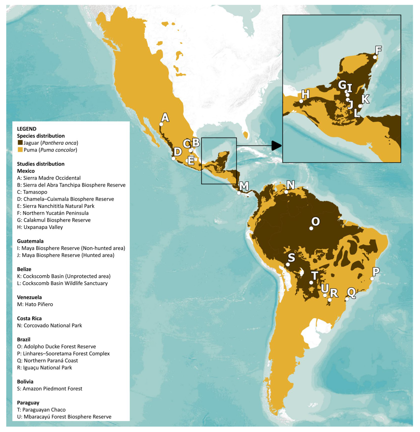 - Aranda, M.; Sánchez-Cordero, V. Prey spectra of jaguar (Panthera onca) and puma (Puma concolor) in tropical forests of Mexico. Stud. Neotrop. Fauna Environ. 1996, 31, 65–67. [Google Scholar] [CrossRef]