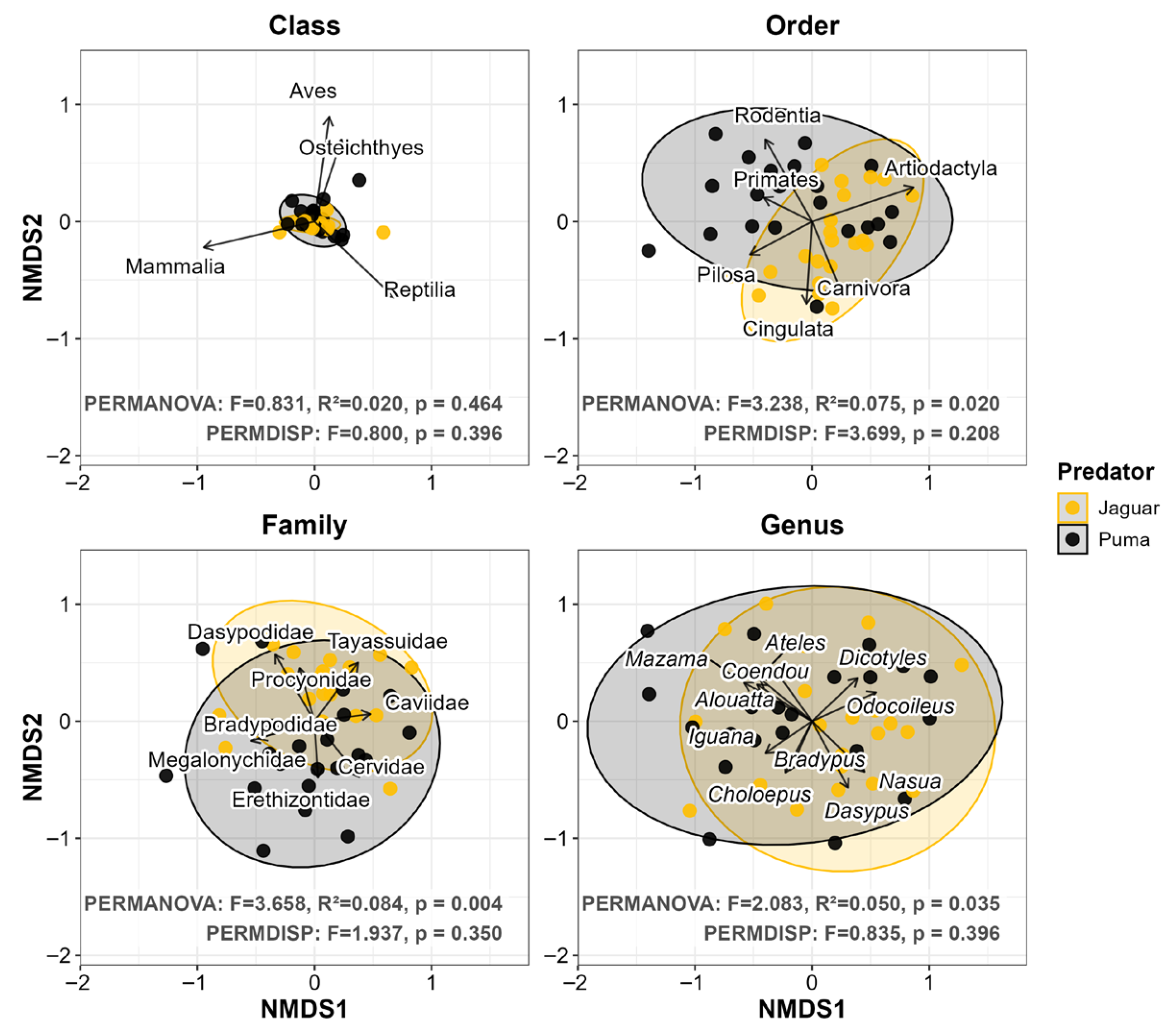 - Flores-Turdera, C.; Ayala, G.; Viscarra, M.; Wallace, R. Comparison of big cat food habits in the Amazon piedmont forest in two Bolivian protected areas. Therya 2021, 12, 75–83. [Google Scholar] [CrossRef]