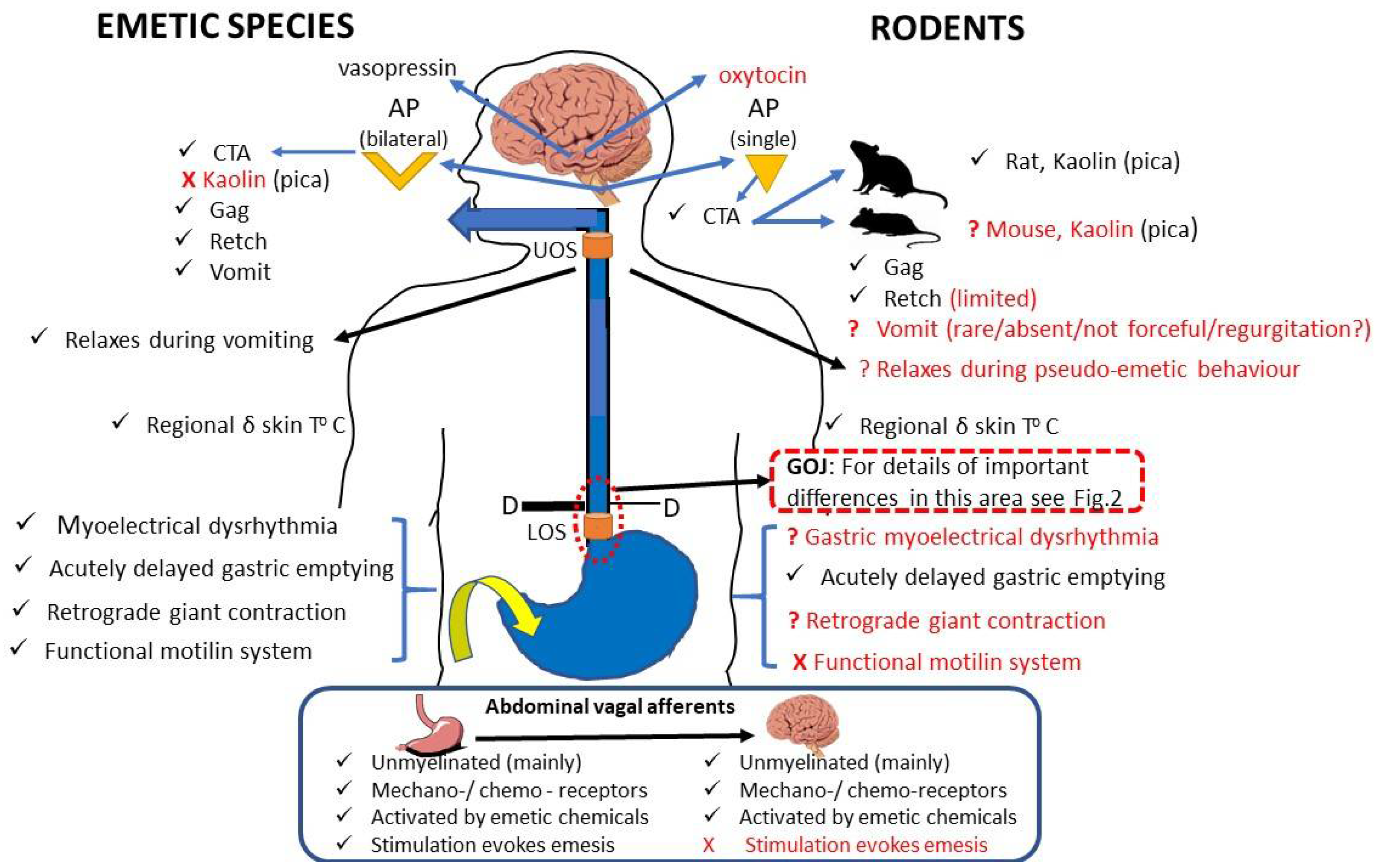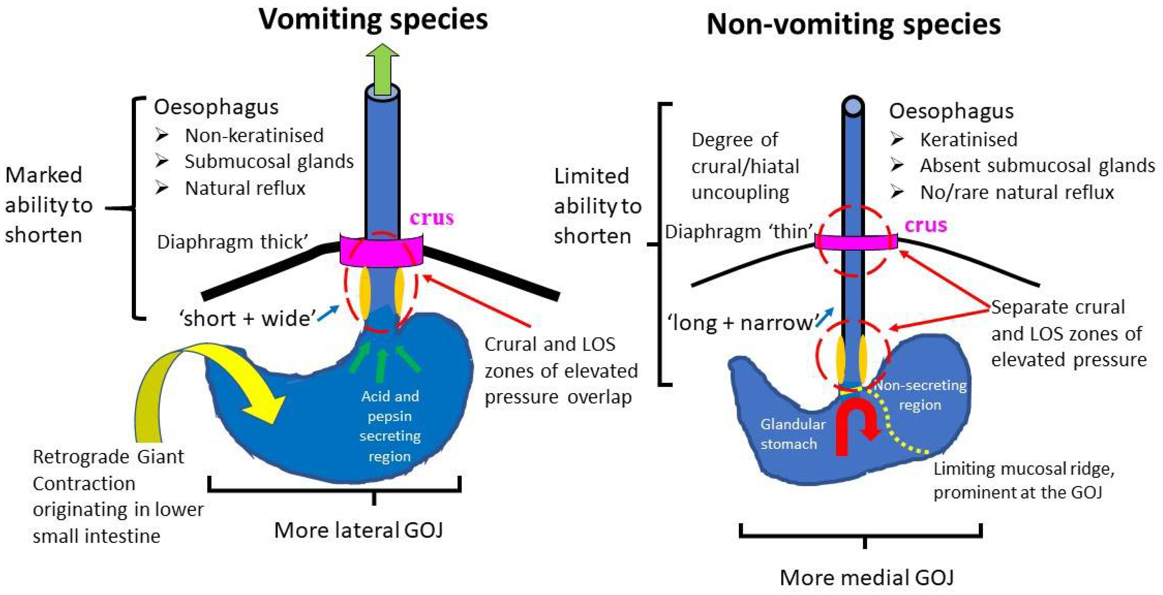 - Behaviours described as ‘vomiting’ are very rarely reported and the descriptions are not convincing compared to the forceful ejection that occurs in established emetic species, especially when the constraints of the GOR barrier on the bulk flow of semi-solid material into the oesophagus are considered.