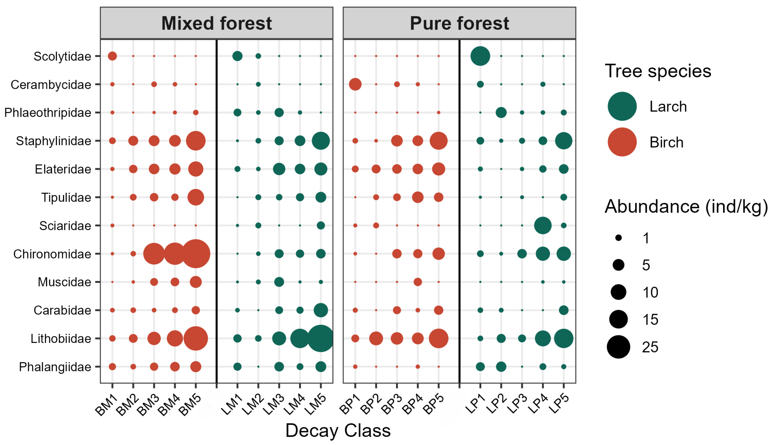 3.3. The Effects of Tree Species, Forest Type, and Decay Class of Woody Debris on Invertebrate Diversity
