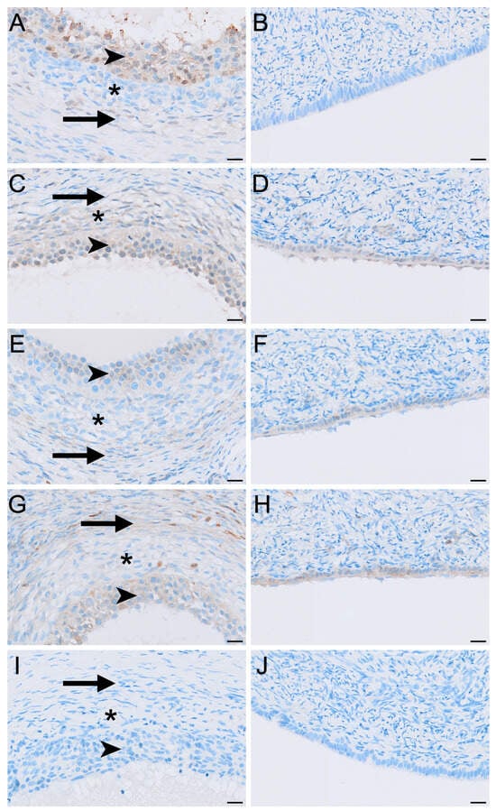 Immunolocalisation of LHR (A,B), FSHR (C,D), aromatase (E,F), HSD3B2 (G,H) and HSD17B1 (I,J) in granulosa and theca layers (A,C,E,G,I) and the germinal epithelium (B,D,F,H,J) in the koala ovary during interoestrous phase. (A) Moderate staining in granulosa cells, negative to mild staining in the theca interna, and negative to mild staining in the theca externa. (B) Negative staining in the germinal epithelium. (C) Mild to moderate staining in granulosa cells, mild staining in the theca interna, and mild staining in the theca externa. (D) Mild staining in the germinal epithelium. (E) Mild staining in granulosa cells, negative to mild staining in the theca interna, and mild staining in the theca externa. (F) Mild staining in the germinal epithelium. (G) Moderate staining in granulosa cells, mild staining in the theca interna, and mild to moderate staining in the theca externa. (H) Moderate staining in the germinal epithelium. (I) Negative staining in granulosa, theca interna, and theca externa. (J) Negative staining in the germinal epithelium. Immunopositive staining is visualised as brown precipitate (DAB), with nuclei counterstained blue with haematoxylin. Arrowheads = granulosa cells; asterisks = theca interna cells; arrows = theca externa cells. Bar = 20 μm.