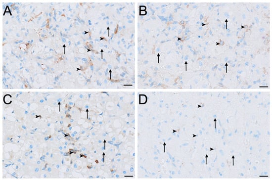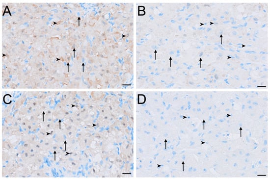 Immunolocalisation of aromatase in interstitial cells of the koala ovary during interoestrous (A), proliferative (B), luteal (C) and lactational anoestrous (D) phases. (A) Interstitial cells during interoestrous phase showing moderate staining in small interstitial cells and mild staining in large interstitial cells. (B) Interstitial cells during proliferative phase showing mild staining in small interstitial cells and negative staining in large interstitial cells. (C) Interstitial cells during luteal phase showing mild to moderate staining in small interstitial cells and negative to mild staining in large interstitial cells. (D) Interstitial cells during lactational anoestrous phase showing negative staining in both small and large interstitial cells. Immunopositive staining is visualised as brown precipitate (DAB), with nuclei counterstained blue with haematoxylin. Arrowheads = small interstitial cells; arrows = large interstitial cells. Bar = 50 μm.