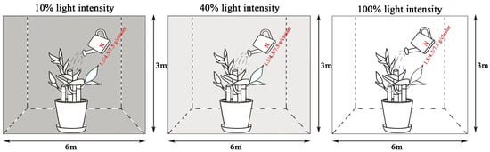 This study utilized a completely randomized design with factorial arrangements of light intensity and nitrogen levels. A gradient of light intensity was achieved by installing sunshades with varying transmittances (100%, 40%, and 10%). Light intensities for each treatment were measured at noon on a sunny day using a photon sensor (LI-190R, LI-COR, Lincoln, NE, USA) and were approximately 500, 200, and 50 μmol·m−2·s−1, respectively (Figure 1). Light conditions remained largely stable throughout the experiment, and the shading effectively controlled light variations between treatments, meeting the experimental requirements for light gradients. Pots were spaced to avoid mutual shading among plants. Although previous studies have reported relatively high light use efficiency at intermediate light levels (e.g., 20–30% light intensity), the light treatments in this study were designed to represent contrasting and management-relevant light environments rather than to identify a narrow photosynthetic optimum. Accordingly, severe shading (10%), moderate shading (40%), and full light (100%) were selected to capture light-limited, typical understory, and open-canopy conditions in bamboo cultivation systems.