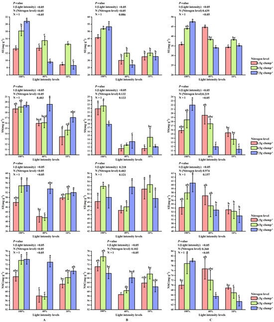 Figure 6. Interaction effects of light intensity and nitrogen concentration on NSC content of Dendrocalamus latiflorus seedlings. (Values are presented as means ± standard deviation (SD). Different letters indicate significant differences among nitrogen treatments within the same light intensity (one-way ANOVA, p < 0.05). (A), initial shooting phase; (B), intermediate shooting phase; (C), late shooting phase; 1.5 g·clump1, nitrogen level was 1.5 g·clump−1; 4.5 g·clump−1, nitrogen level was 4.5 g·clump−1; 7.5 g·clump−1, nitrogen level was 7.5 g·clump−1. Abbreviations: SU, sucrose; SS, soluble sugar; ST, starch; NSCs, nonstructural carbohydrates).
