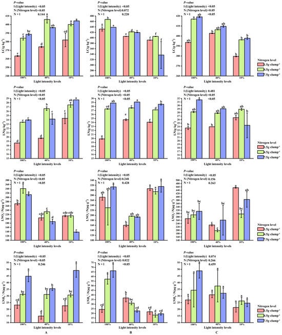 At the early stage of shooting, both light intensity and nitrogen treatments had significant effects on LN and LC (p < 0.05). The LC/LN, which mainly reflected integrated carbon-nitrogen status and showed limited additional explanatory power, is presented in Supplementary Figure S4. A significant interaction effect between light and nitrogen was also observed for LC content (p < 0.05). Under 10% and 100% light intensities, LN and LC contents increased with increasing nitrogen levels. In contrast, under 40% light intensity, the highest LN and LC contents were recorded under medium nitrogen treatment (26.62 and 405.91 g·kg−1, respectively) (Figure 7A).