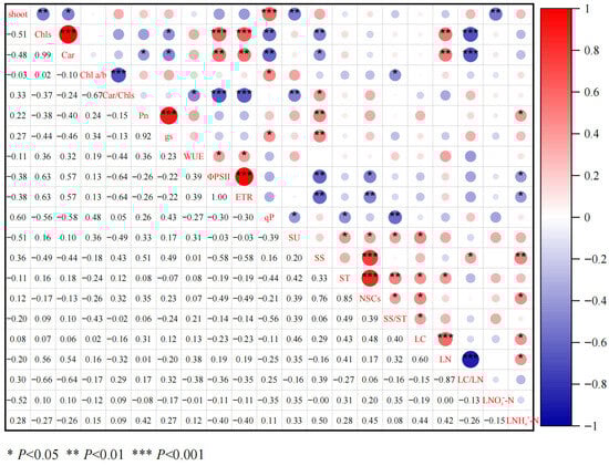Figure 8. Pearson correlation among the influencing factors. (Abbreviations: shoot: number of emerging shoots; Chls, total chlorophylls; Car, carotenoids; Chl a/b, chlorophyll a/b; Car/Chls, carotenoids to total chlorophyll; Pn, net photosynthetic rate; gs, stomatal conductance; WUE, water use efficiency; ΦPSII, PSII actual photochemical efficiency; ETR, apparent photosynthetic electron transport rate; qP, photochemical quenching coefficient; SU, sucrose; SS, soluble sugar; NSCs, nonstructural carbohydrates; SS/ST, soluble sugar /starch; LC, leaf total carbon; LN, leaf total nitrogen; LC/LN, leaf total carbon / total nitrogen; LNO3-N, leaf nitrate; LNH4+-N, leaf ammonium nitrogen).