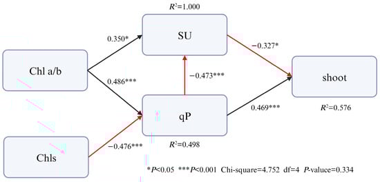 Chlorophyll is the fundamental photosynthetic pigment in green plants and reflects the photosynthetic potential of leaves [42]. Higher chlorophyll content is generally associated with greater photosynthetic capacity and assimilate production [43]. In the present analysis, both Chls and Chl a/b showed indirect statistical associations with shoot germination through their relationships with SU and qP (Figure 9). Variation in chlorophyll content and the Chl a/b ratio is commonly linked to adjustments in light utilization efficiency under different light environments [44,45].