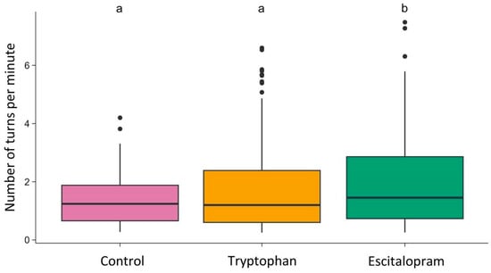 Number of turns per minute in the control, tryptophan-treated, and escitalopram-treated groups. The horizontal line indicates the group median. Dots represent individual observations. Groups sharing the same letter are not significantly different; groups with different letters differ significantly.