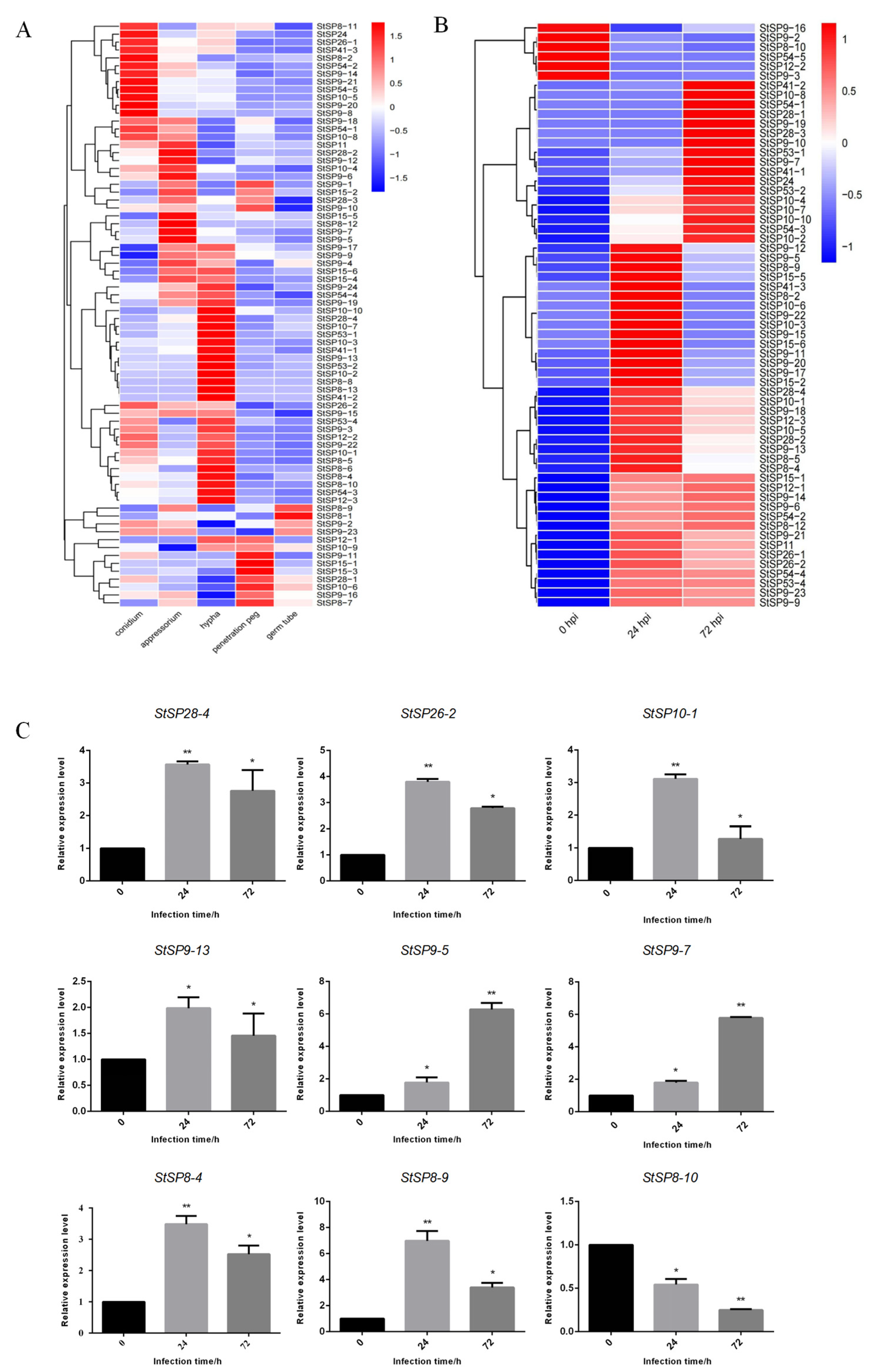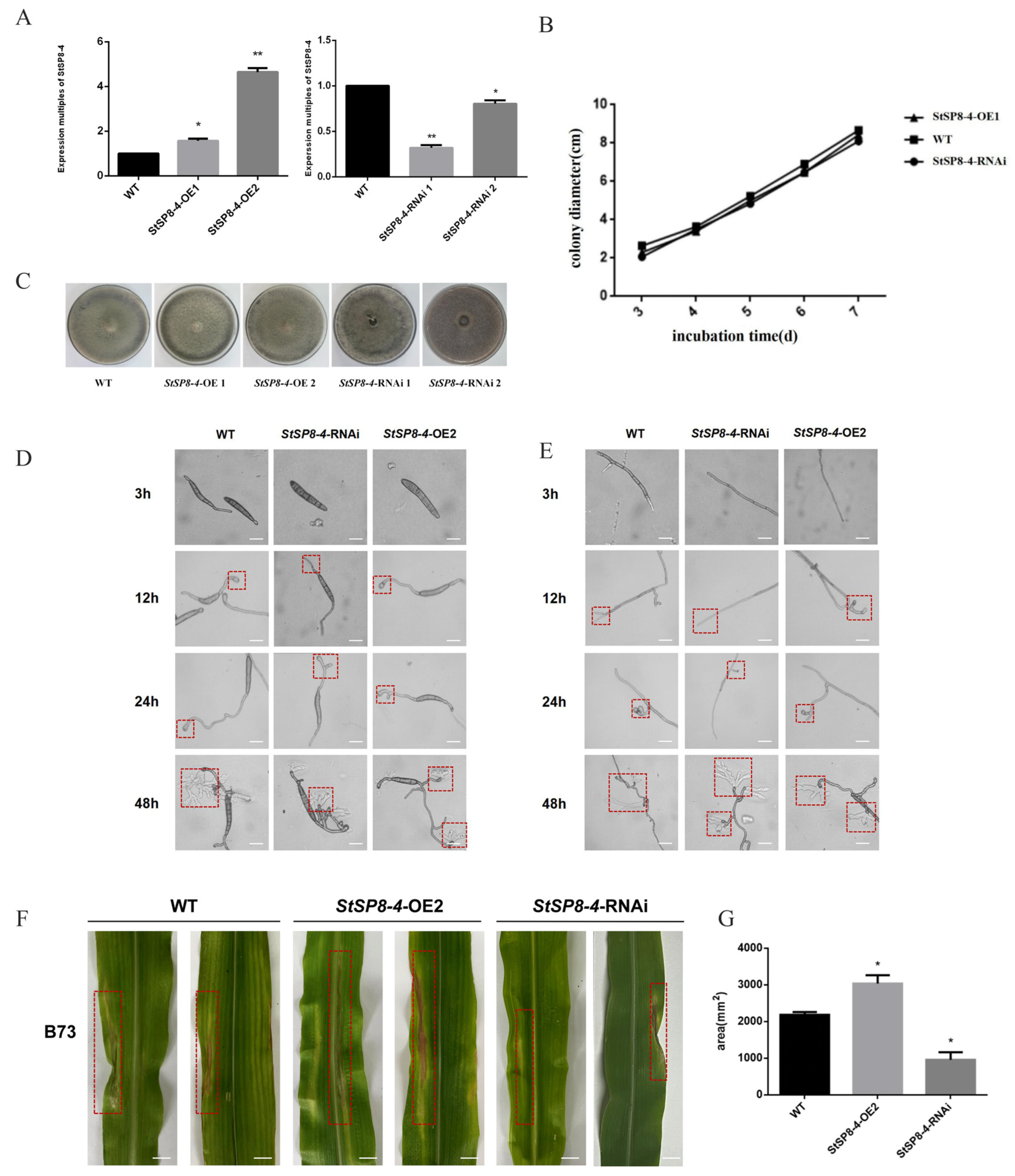 3.5. StSP8-4 Exerts No Influence on Development but Is Involved in the Pathogenicity of S. turcica