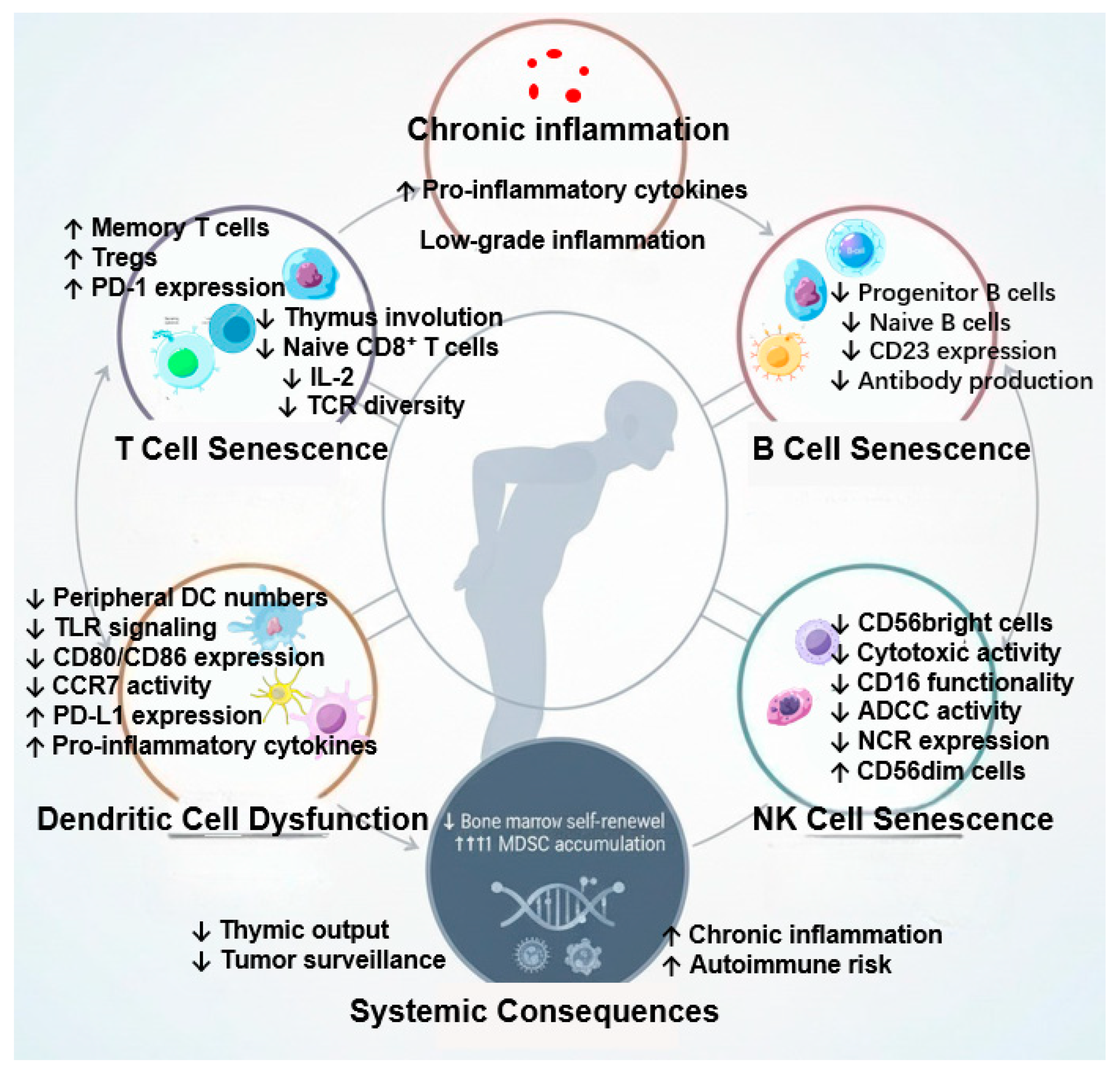 - Liu, Q.; Li, J.; Sun, X.; Lin, J.; Yu, Z.; Xiao, Y.; Li, D.; Sun, B.; Bao, H.; Liu, Y. Immunosenescence and cancer: Molecular hallmarks, tumor microenvironment remodeling, and age-specific immunotherapy challenges. J. Hematol. Oncol. 2025, 18, 81. [Google Scholar] [CrossRef]