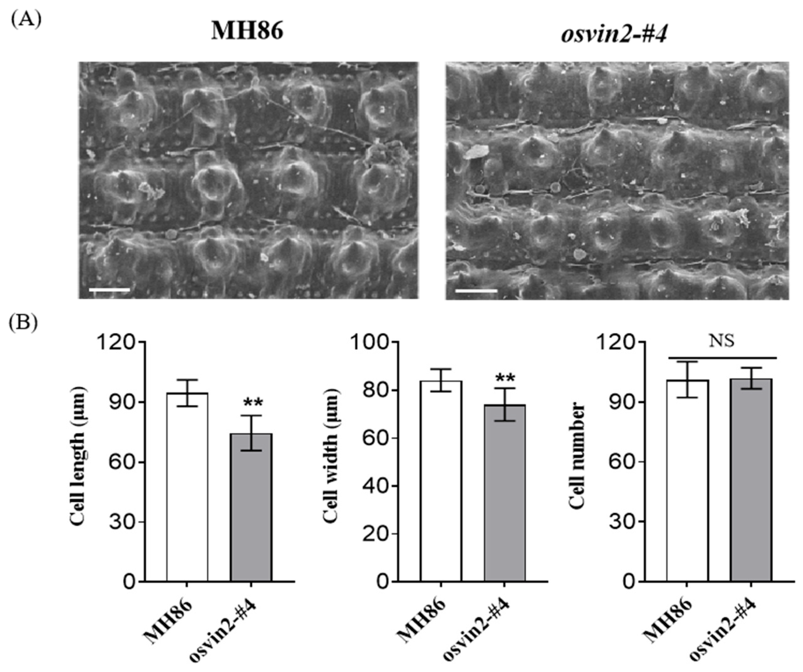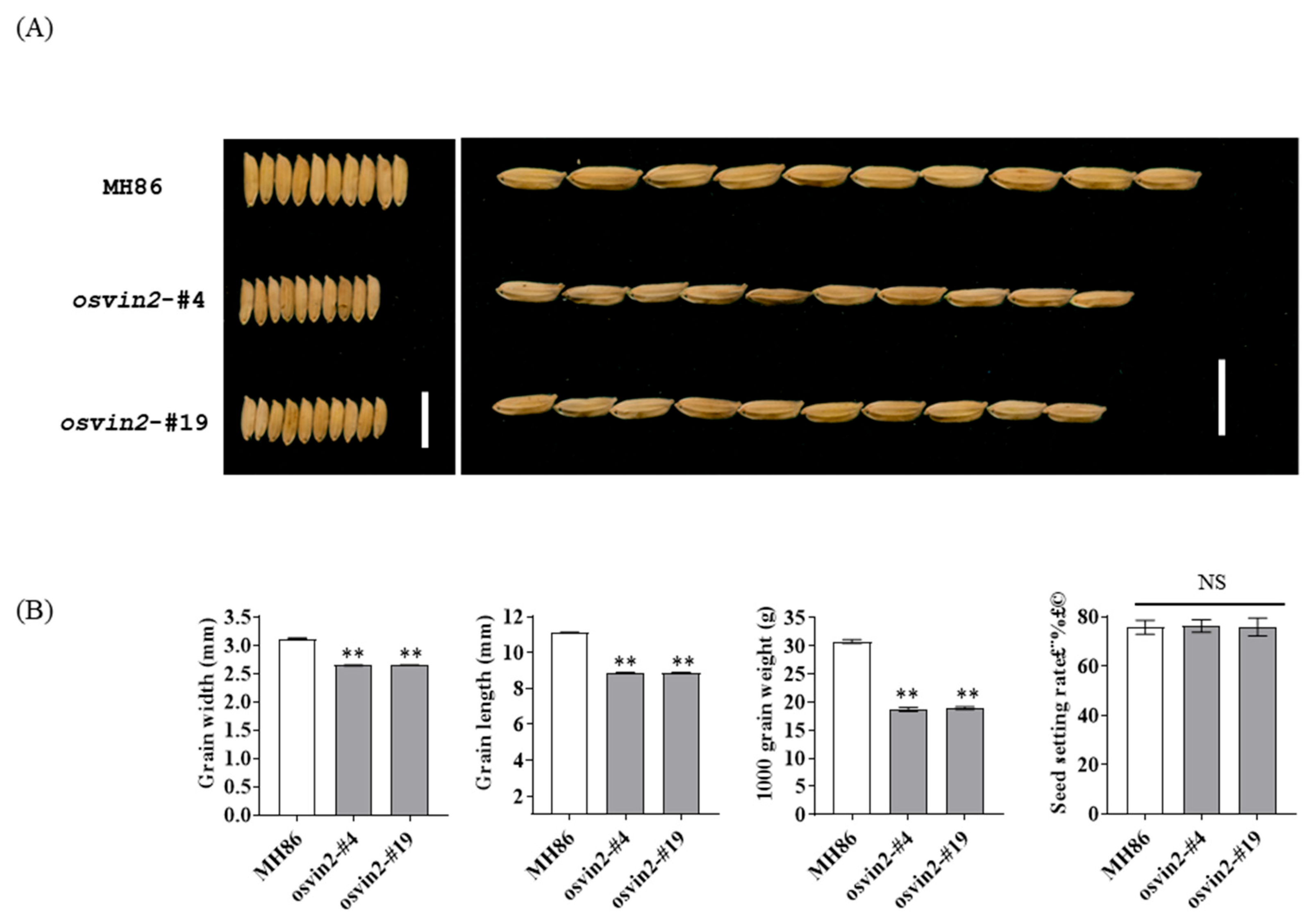 3.4. Phenotypic Analysis of Grain Size in OsVIN2 Mutants