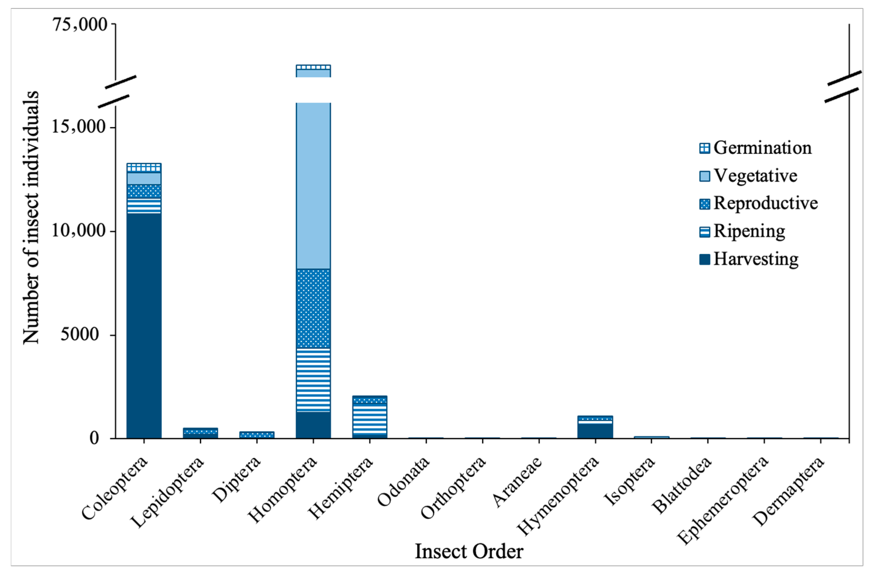 We acknowledge that light traps selectively attract nocturnal, phototactic insects, which may lead to an overrepresentation of certain taxa, such as Coleoptera, in our samples. Other insect orders that are less phototactic or more active in different microhabitats may be underrepresented. While light traps are effective for monitoring pest populations and overall insect activity, our results should be interpreted with caution, recognizing that they reflect primarily the subset of insects attracted to light rather than the full diversity of the rice field insect community. Future studies combining multiple sampling methods could provide a more comprehensive assessment of insect diversity.