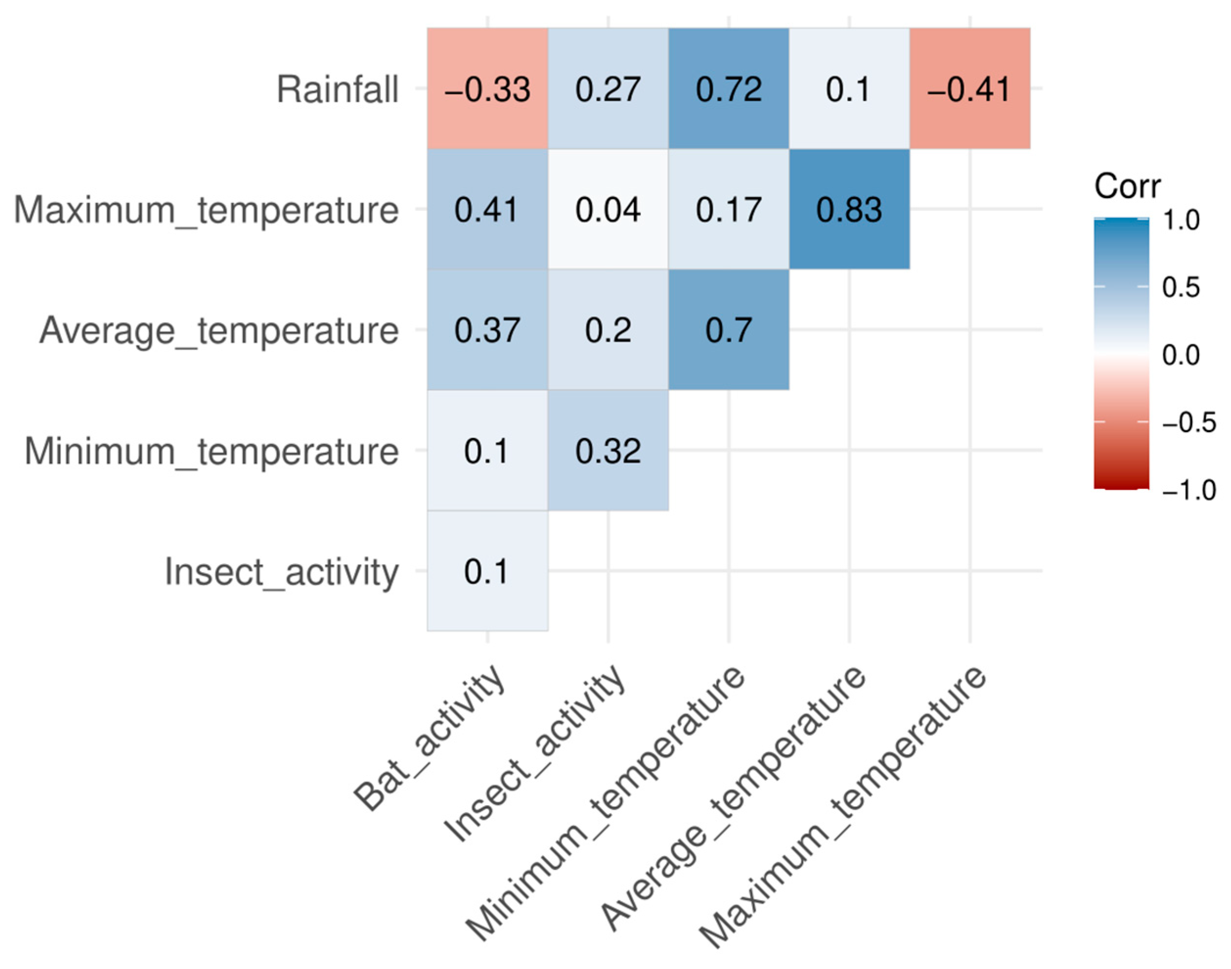 Based on the correlogram, the results show that the bat activity was positively correlated with the average temperature and negatively correlated with maximum temperature and rainfall (see diagnostic plot in Supplementary Material Table S1). The insect activity was positively correlated with minimum temperature and rainfall (Figure 5). The multiple linear regression model met the assumptions of linearity, homoscedasticity, independence and normality of residuals, as assessed using diagnostic plots (see diagnostic plot in Supplementary Material Figure S1) [29]. It is important to note that these patterns reflect associations rather than causation. While climatic factors appear linked with bat activity, our analyses cannot confirm a direct causal effect. These correlations suggest potential influences of microclimatic conditions on bat foraging behavior, which should be interpreted with caution.