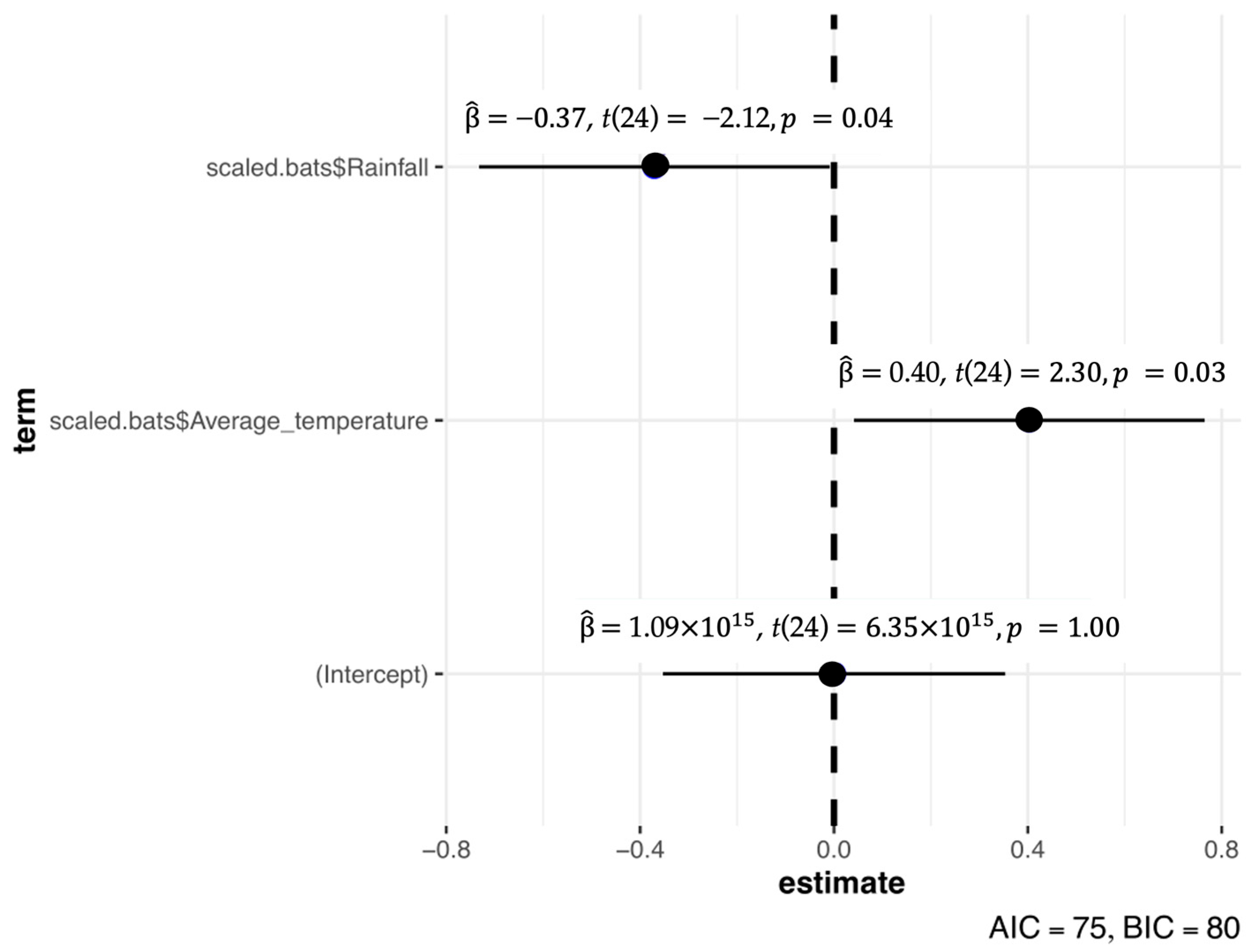 The multiple linear regression model explained a moderate proportion of the variation in overall bat activity (R2 = 0.35; Figure 6). Minimum temperature had a significant positive effect on bat activity (standardized β = 0.40, t(24) = 2.30, p = 0.03), whereas rainfall showed a significant negative effect (standardized β = −0.37, t(24) = −2.12, p = 0.04). Average temperature was not retained as a significant predictor after model selection. Separate regression analysis for the five dominant bat species (Rhinolophus pusillus, Myotis ridleyi, Hipposideros larvatus, Rhinolophus malayanus and Rhinolophus refulgens) did not yield statistically significant models (all p > 0.05; see Supplementary Material Table S2) and were therefore discarded.