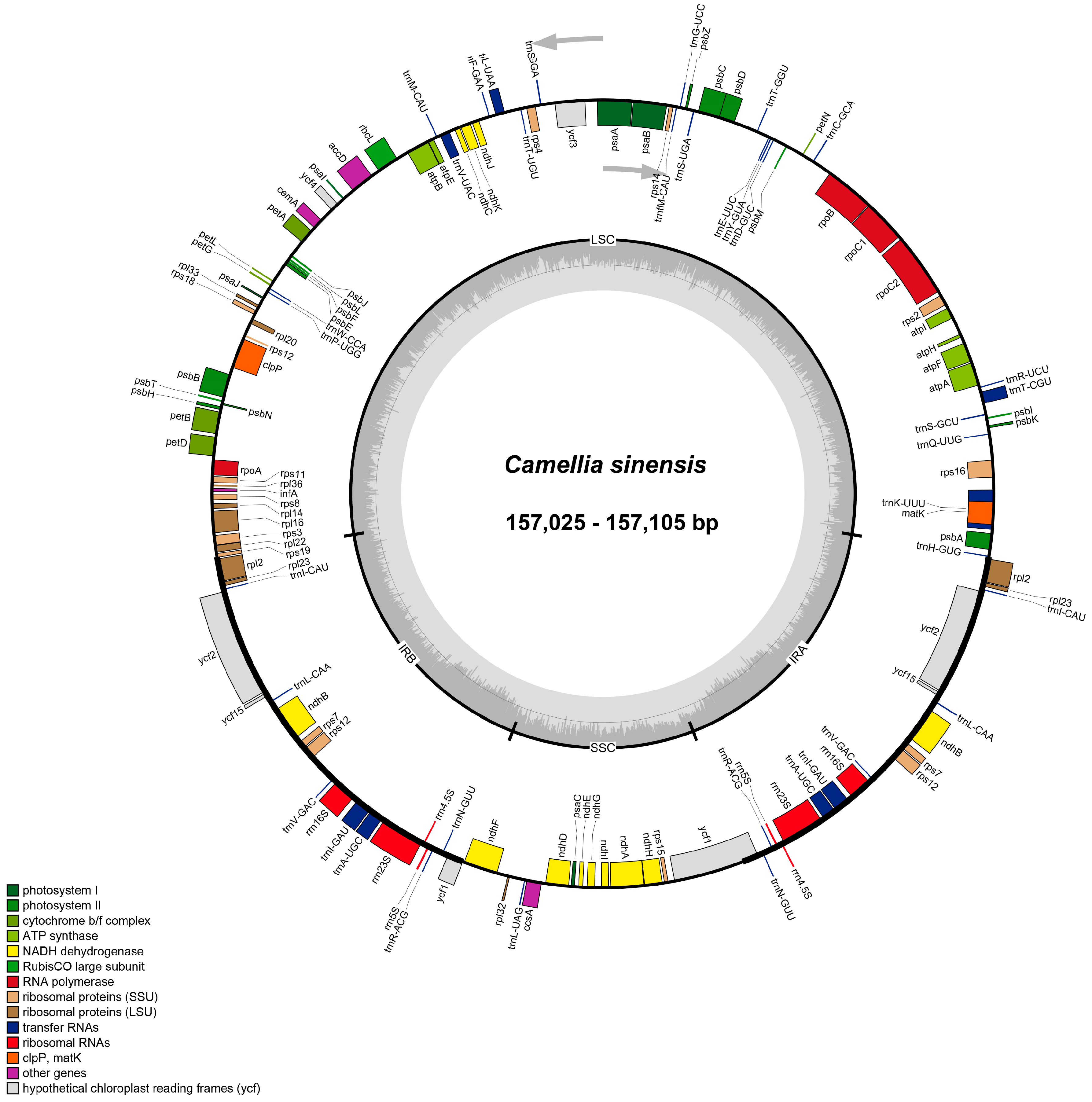 | tRNA genes | trnA-UGC(×2), trnC-GCA, trnD-GUC, trnE-UUC, trnF-GAA, trnfM-CAU, trnG-UCC, trnH-GUG, trnI-CAU(×2), trnI-GAU(×2), trnK-UUU, trnL-CAA(×2), trnL-UAA, trnL-UAG, trnM-CAU, trnN-GUU(×2), trnP-UGG, trnQ-UUG, trnR-ACG(×2), trnR-UCU, trnS-GCU, trnS-GGA, trnS-UGA, trnT-CGU, trnT-GGU, trnT-UGU, trnV-GAC(×2), trnV-UAC, trnW-CCA, trnY-GUA |
