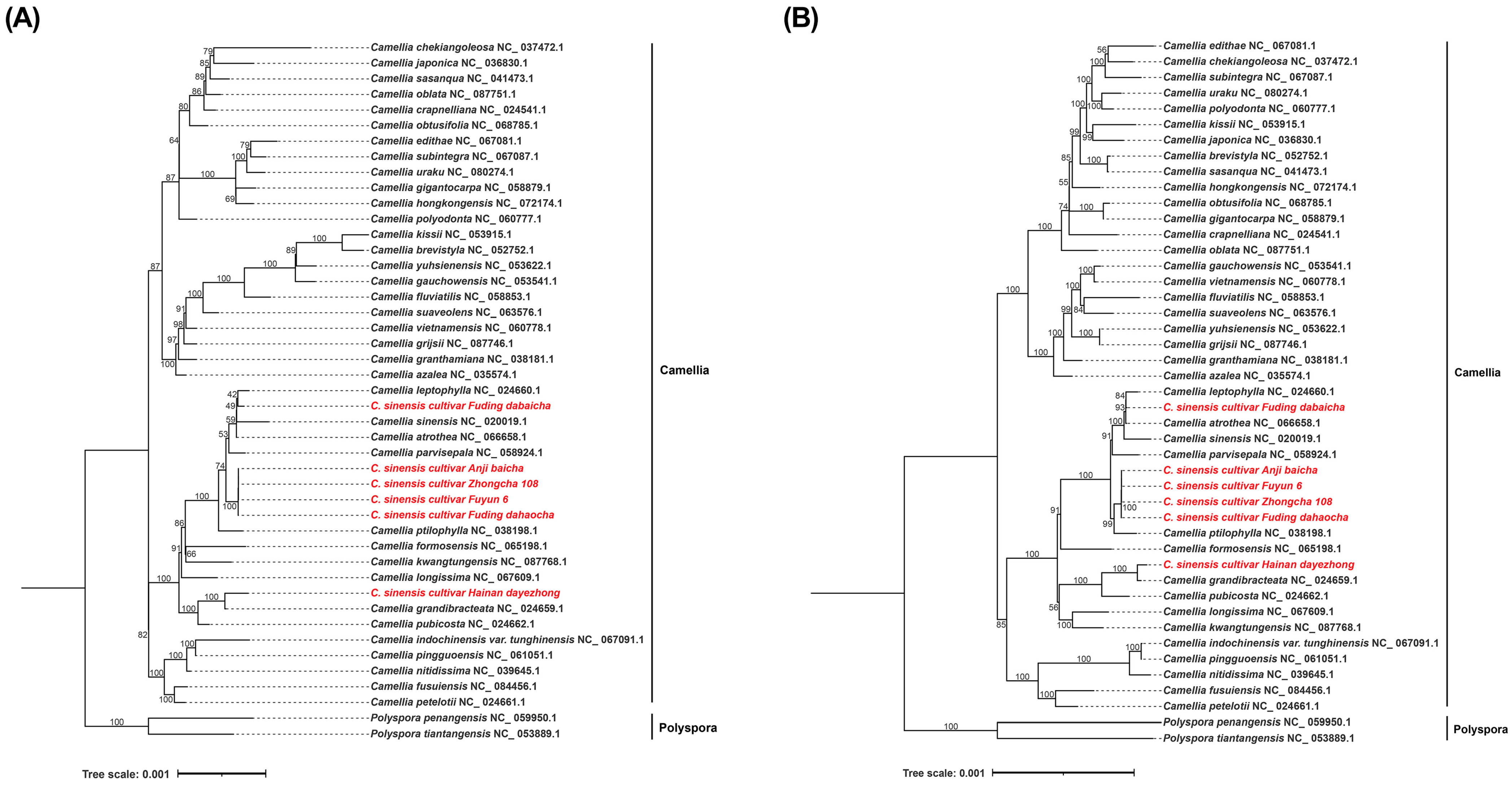 - Li, J.; Qiu, X.-Y.; Qin, Y.; Tang, H.; Tang, J.; Liu, T.-T.; Xiao, L.-Z.; Luo, H. The chloroplast genome of Camellia sinensis var. assamica cv. Duntsa (Theaceae) and comparative genome analysis: Mutational hotspots and phylogenetic relationships. Genet. Resour. Crop Evol. 2025, 72, 845–862. [Google Scholar] [CrossRef]