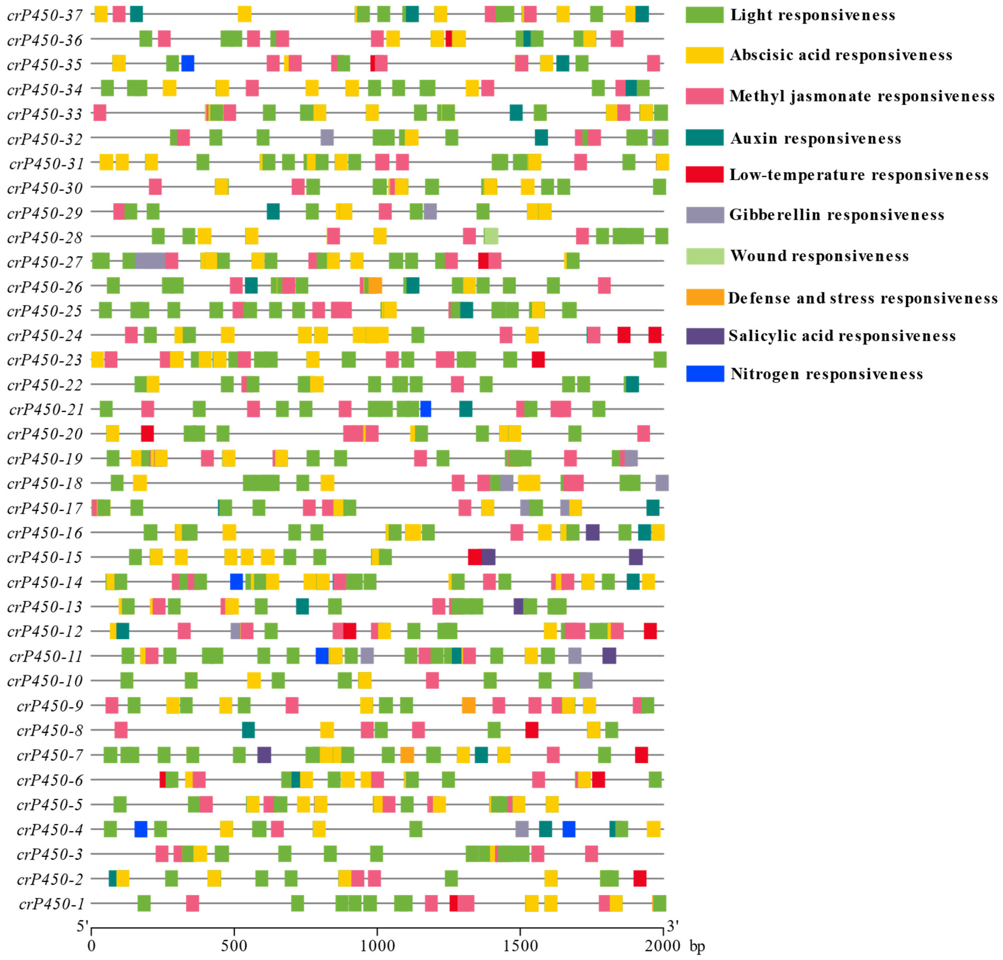 3.4. Distribution of Cis-Acting Elements in the Promoter Regions of crP450 Genes in Chlamydomonas reinhardtii
