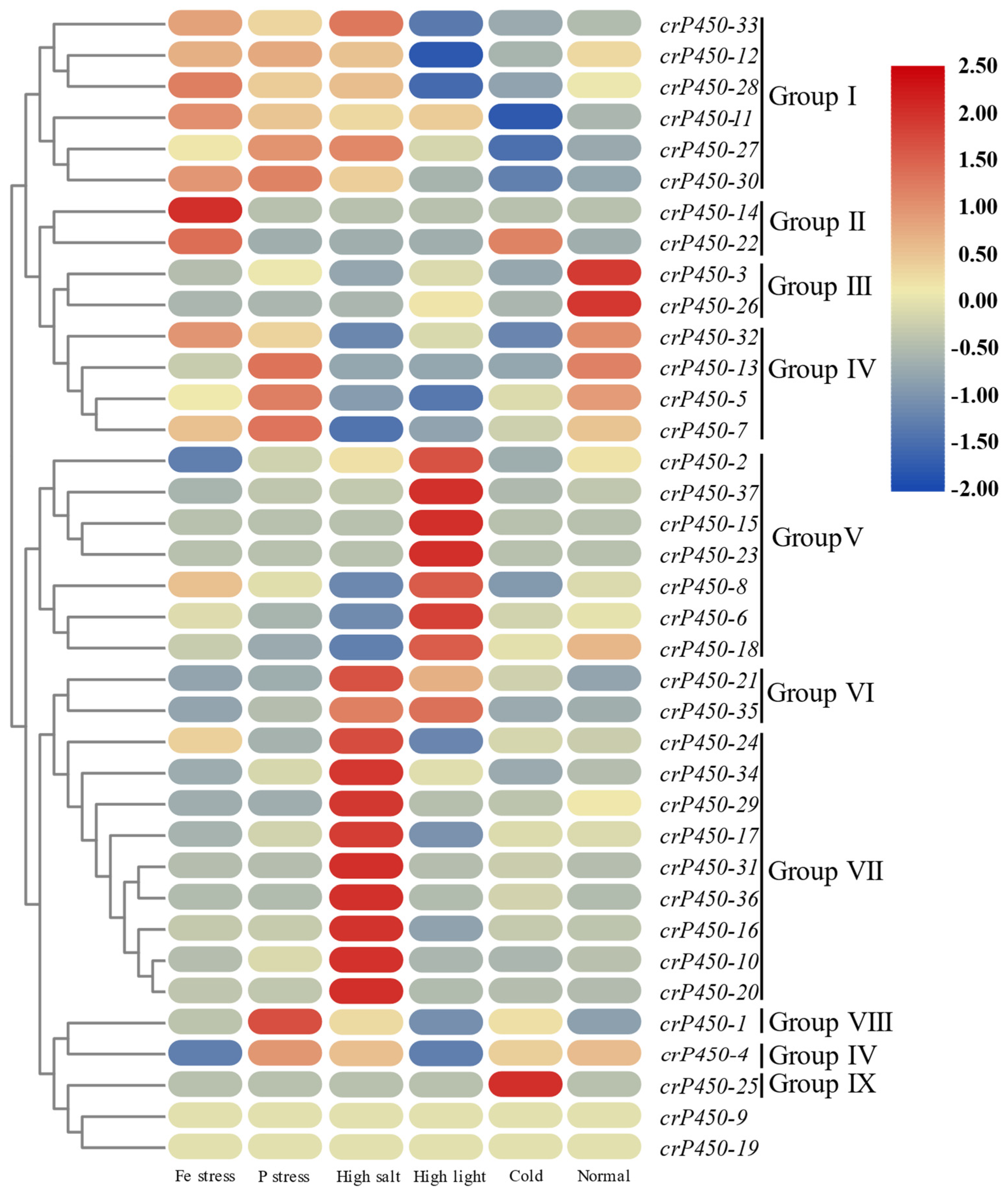 3.6. Expression of crP450 Genes in Chlamydomonas reinhardtii Under Different Environmental Conditions