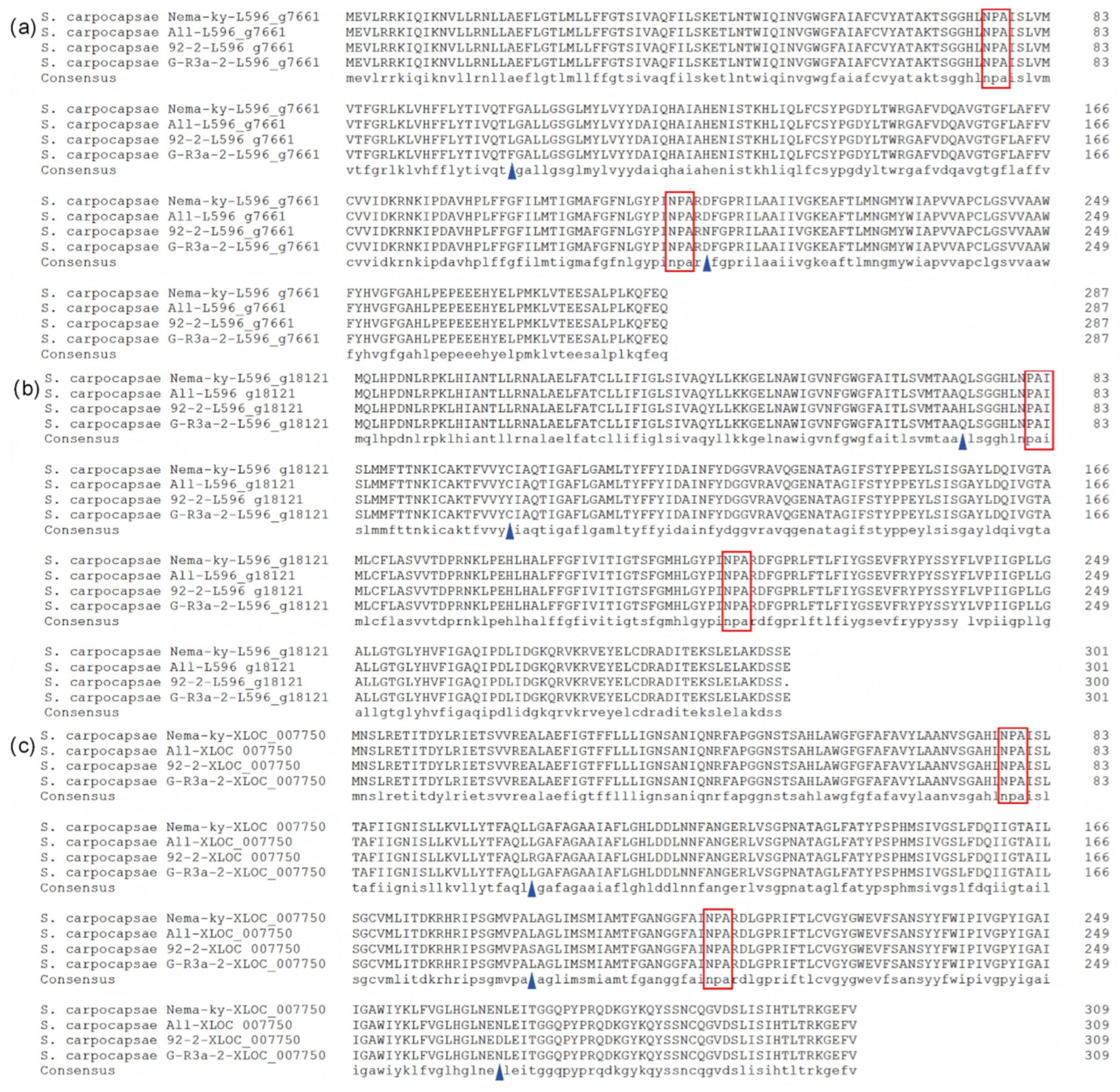 Figure 1. Amino acid sequence alignment of aquaporins from different Steinernema carpocapsae strains. (a), L596_g7661; (b), L596_g18121; (c), XLOC_007750. Boxes indicate the conserved NPA motifs. Triangles denote positions of amino acid variations.