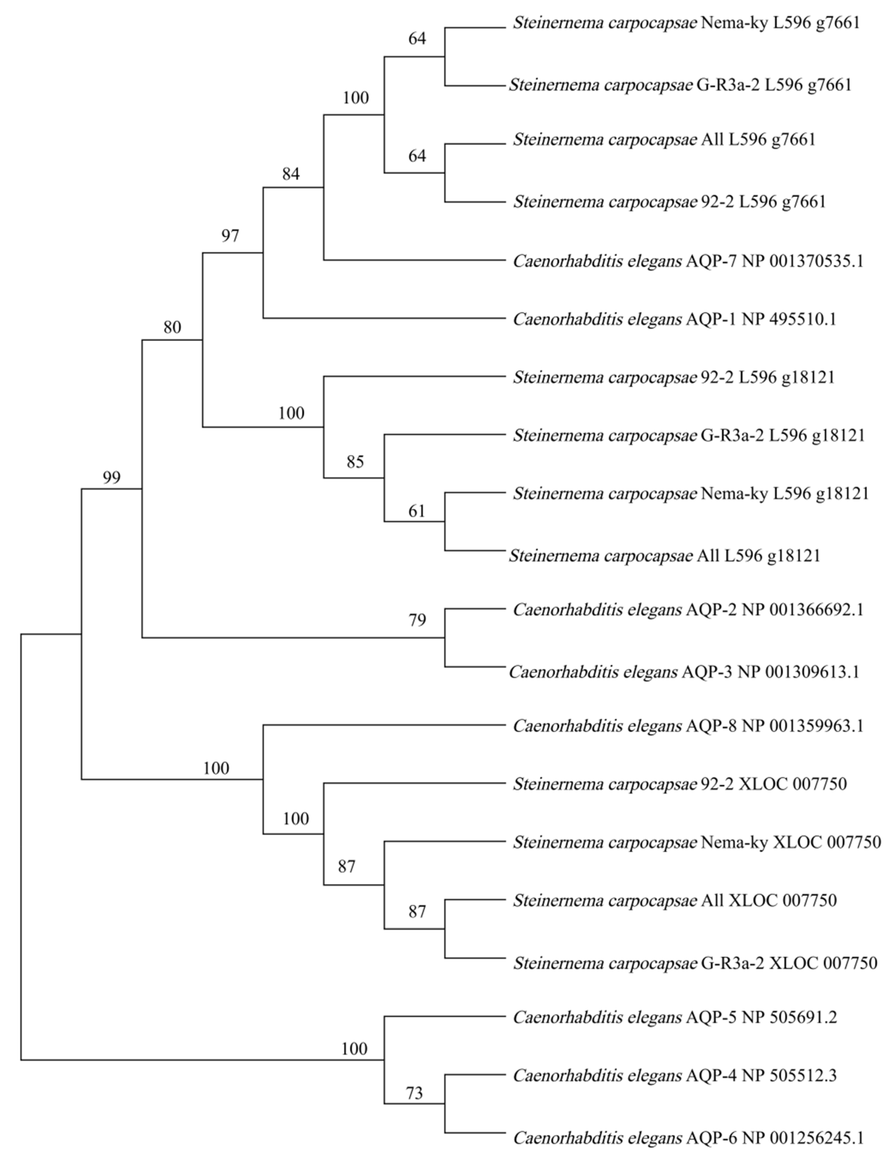 A phylogenetic tree was constructed using the amino acid sequences of the three AQPs from the four S. carpocapsae strains and C. elegans AQP1 to AQP8 (GenBank Accessions Numbers provided in Figure 2). L596_g7661 and L596_g18121 from all S. carpocapsae strains clustered closely with C. elegans AQP1 and AQP7. XLOC_007750 formed a cluster with C. elegans AQP8. All these AQPs belong to the aquaglyceroporin subfamily, which transports both water and small solutes like glycerol.