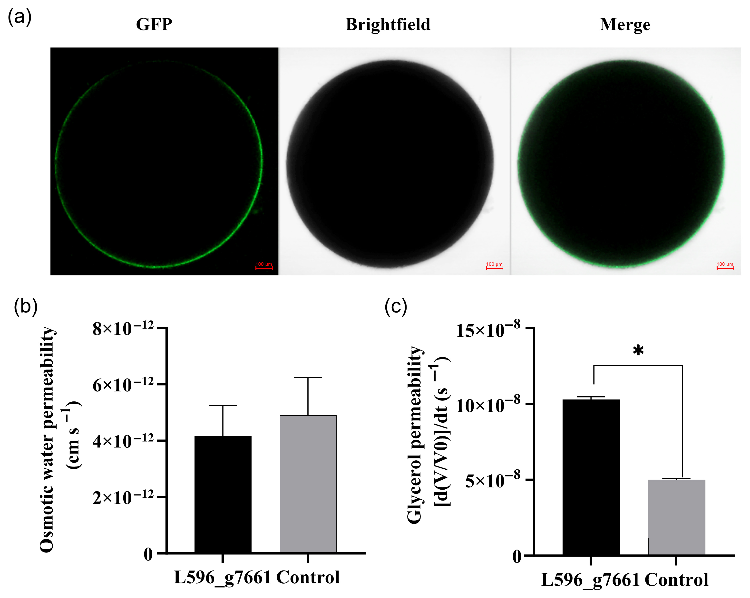 Figure 4. Functional characterization of aquaporin L596_g7661 in Xenopus oocytes. (a), Representative images of an oocyte expressing the AQP L596_g7661-GFP fusion protein. From left to right: GFP (fluorescence signal of the fusion protein), Brightfield (DIC image), and Merge (overlay of both channels). The scale bar represents 100 µm. (b), Osmotic water permeability (Pf) of oocytes expressing AQP L596_g7661 compared to water-injected controls. (c), Glycerol permeability of oocytes expressing AQP L596_g7661. Asterisk (*) above the bars indicates a significant difference between the oocytes expressing AQP L596_g7661 and the control (Paired-sample t-test, n = 7, p < 0.05).