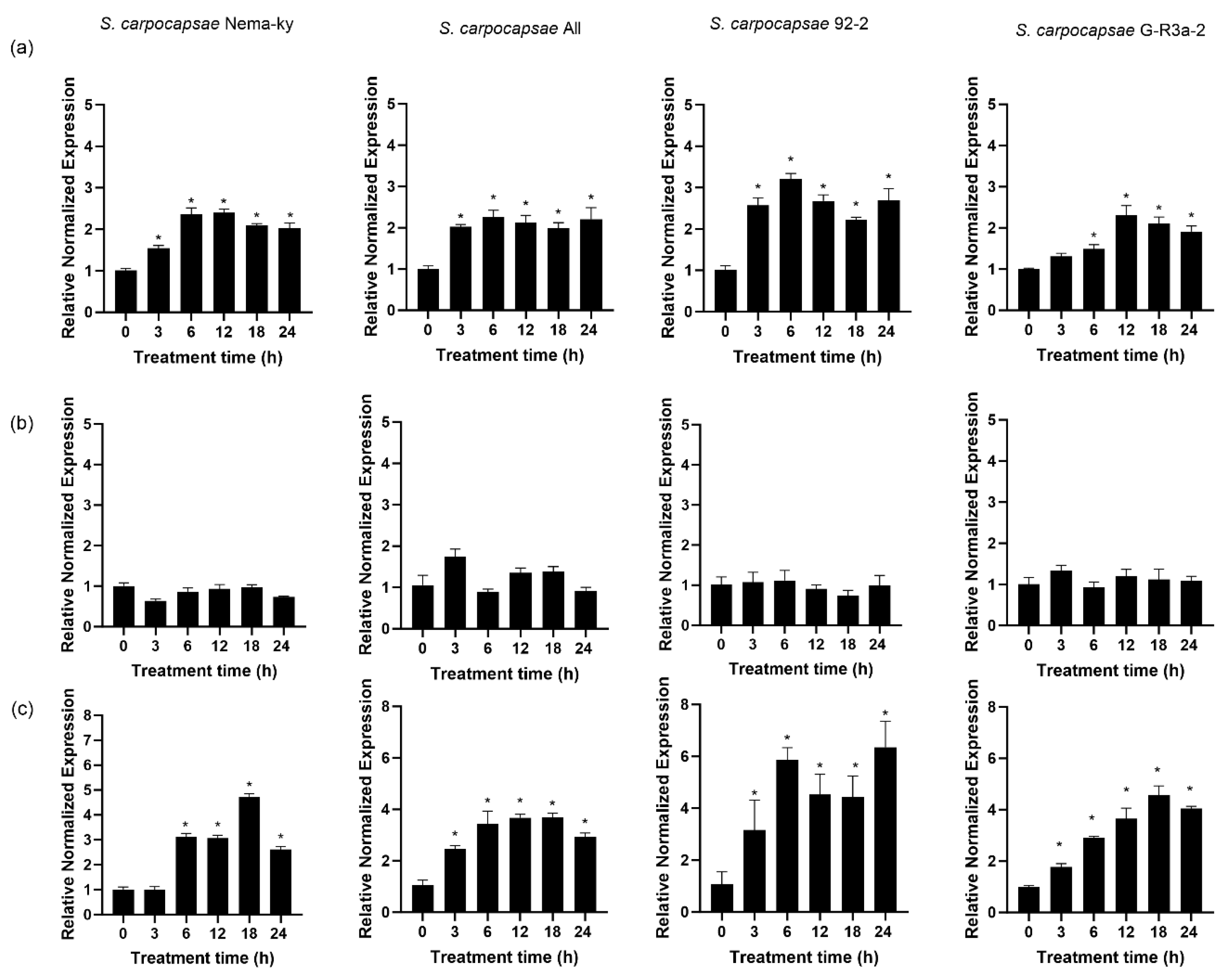 Figure 5. Relative expression levels of aquaporin genes in different Steinernema carpocapsae strains following osmotic treatment over time. (a), L596_g7661; (b), L596_g18121; (c), XLOC_007750. Asterisk (*) above the bars indicates significant difference between treatment time and the control (0 h) (Paired-sample t-test, n = 6, p < 0.05).