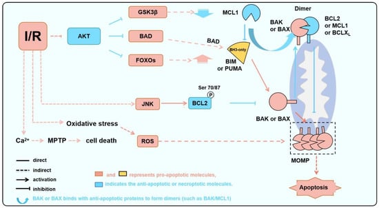 BAK/BAX serves as a critical node in IR-induced apoptosis. During IR, AKT is inhibited, JNK is abnormally activated, and ROS is increased due to oxidative stress. These processes lead to a decrease in anti-apoptotic protein levels or activities and an increase in pro-apoptotic protein levels or activities, thereby activating BAK or BAX and inducing apoptosis.