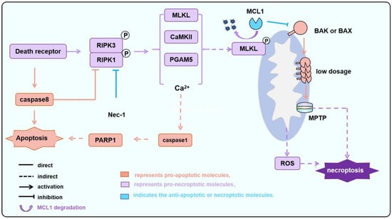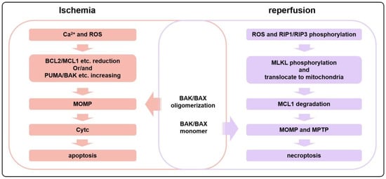During the initial stages of ischemia, cardiomyocytes tend to undergo apoptosis more frequently, whereas necroptosis is more prevalent during reperfusion. In ischemia, an influx of Ca2+ and the production of a large amount of ROS induce a reduction in the amount or activities of anti-apoptotic proteins such as BCL2 or MCL1 and an increase in pro-apoptotic proteins, leading to apoptosis. However, during reperfusion, the activation of the RIP1/RIP3 pathway induces the phosphorylation and translocation of MLKL to mitochondria, resulting in the degradation of MCL1. This triggers the opening of the MPTP, as well as the BAK/BAX-dependent MOMP, ultimately leading to necroptosis.