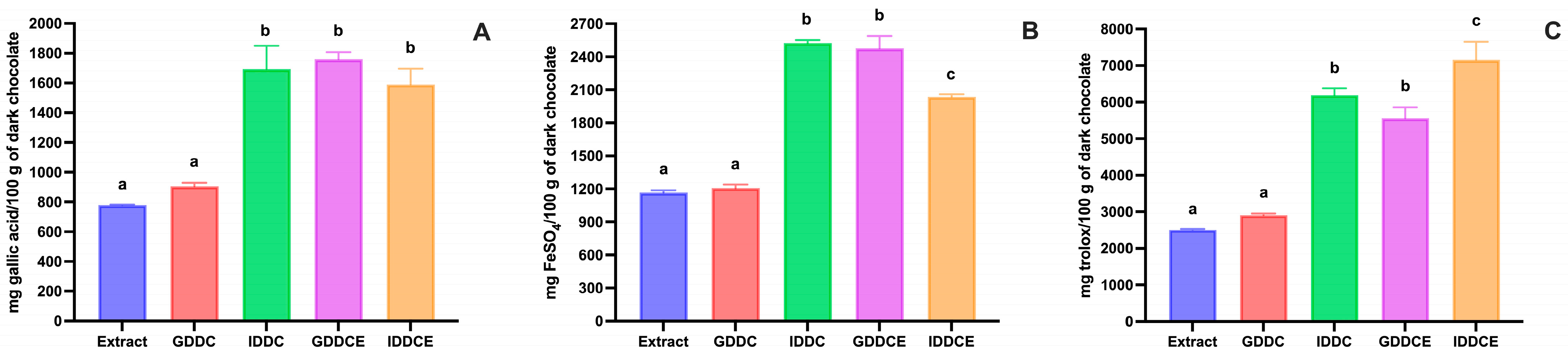 3.2. Effect of In Vitro Gastrointestinal Digestion on Total Phenolic Compounds and Antioxidant Activity in Dark Chocolate and Dark Chocolate Phenolic Compounds Extract