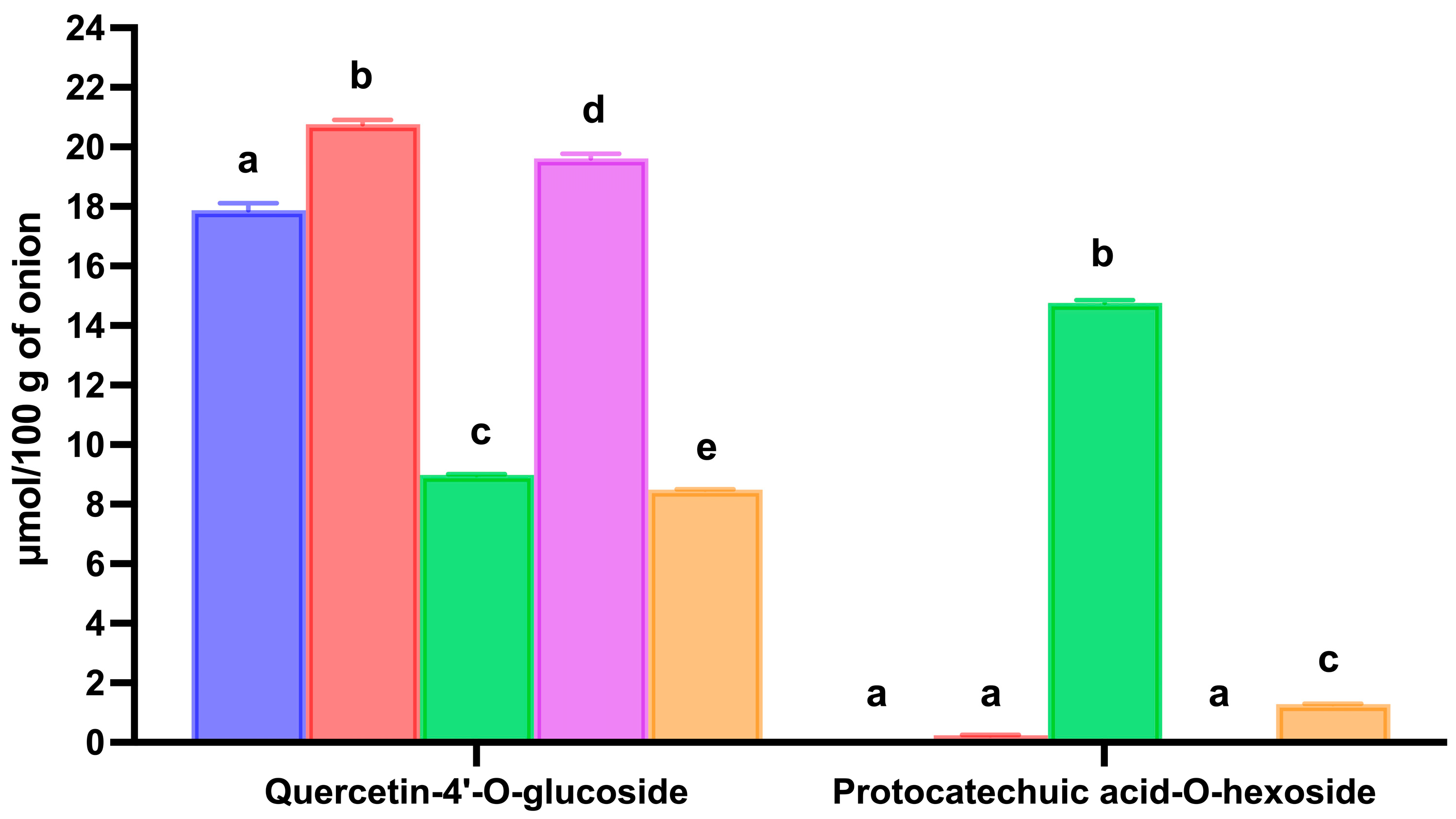 | Quercetin-4′-O-glucoside | 17.87 ± 0.24 a | 20.76 ± 0.15 b | 116.2 | 8.99 ± 0.02 c | 50.3 | 19.61 ± 0.16 d | 109.8 | 8.49 ± 0.01 e | 47.5 |