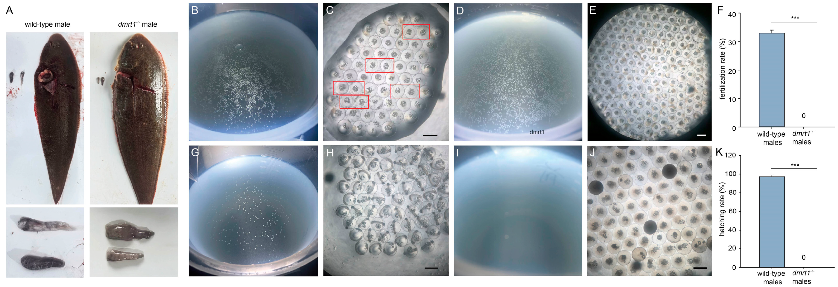 dmrt1−/− ZZ males and wild-type males, the eggs obtained through artificial induction from one wild-type female tongue sole were divided into two groups. One group was fertilized with sperm from wild-type males, and the other with sperm from