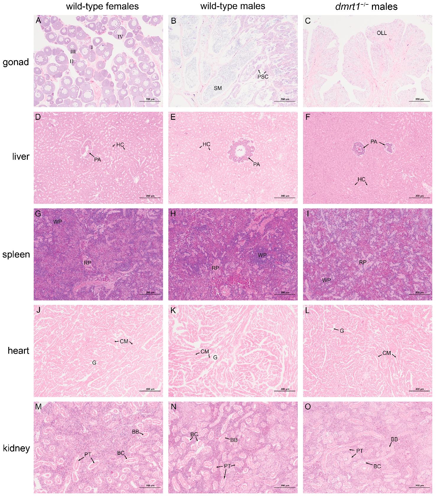 dmrt1 mutation did not cause any pathological changes in other parenchymal organs, including heart, liver, spleen, and kidney. Together with its predominant expression in testis, these results demonstrated that