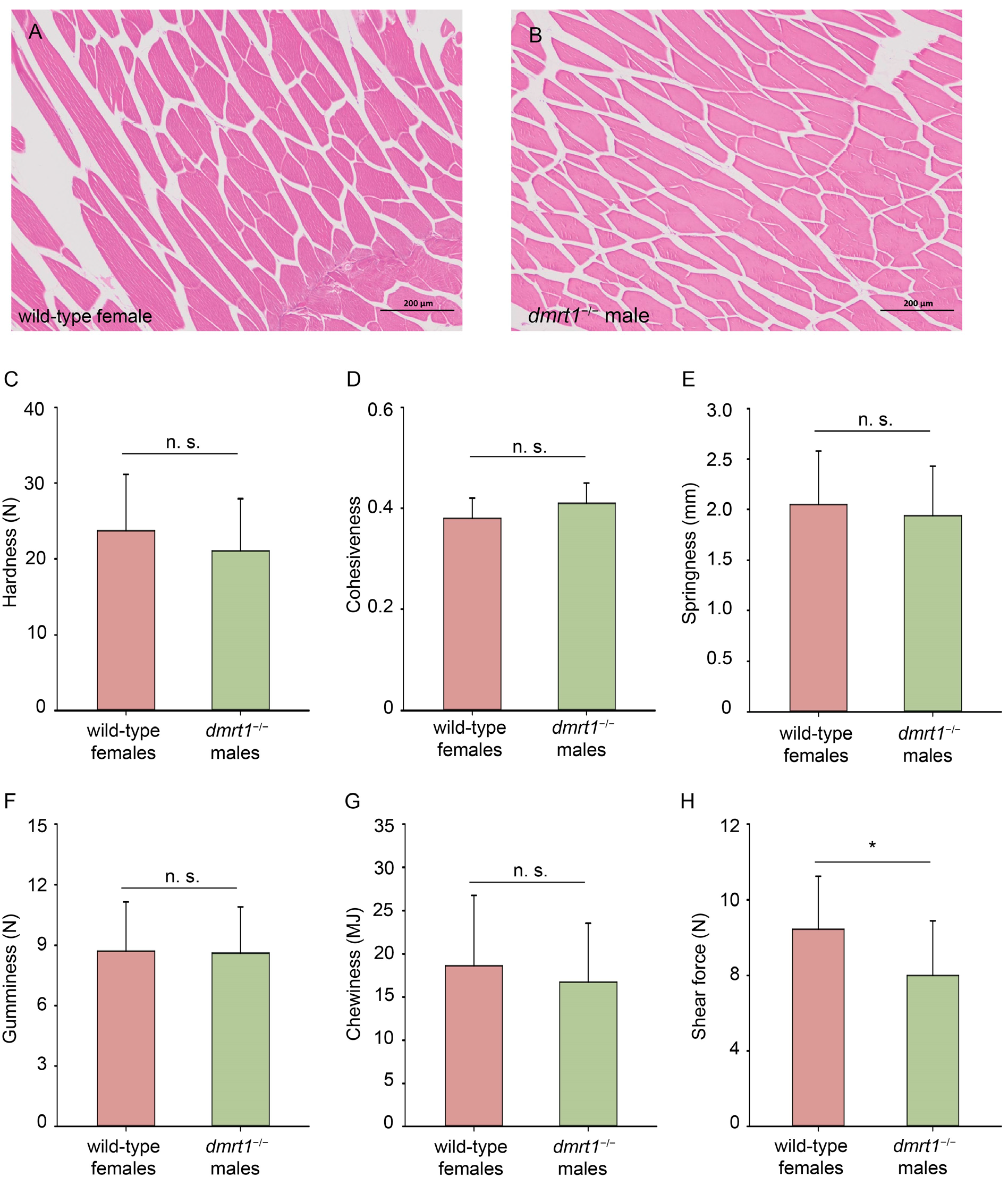 Ten fish from wild-type females and dmrt1−/− ZZ males of tongue sole were used for the evaluation of flesh quality. The entire fish filet was excised from the backbone and shipped on dry ice to Standards Testing Group Co., Ltd. (Qingdao, China). From each fillet, six muscle blocks (three from each side of the lateral line) were collected. These blocks were then randomly divided into two groups: three for TPA (Texture Profile Analysis) testing and three for shear force measurement. A section of muscle (2 cm3) from each specimen was excised and placed on the platform of a TMS-Pro texture meter (Food Technology Corporation, Sterling, VA, USA). A cylindrical metal probe with a diameter of 36 mm was used for the TPA test. Each sample underwent 2 cycles of compression analysis with a compression level of 60%, with a 30 mm/min test speed and 0.05 N trigger stress. For the shear force measurement, a precision cutting blade was employed. The test commenced (trigger force: 0.05 N) once the probe contacted the sample, shearing downward at 30 mm/min until complete severance.