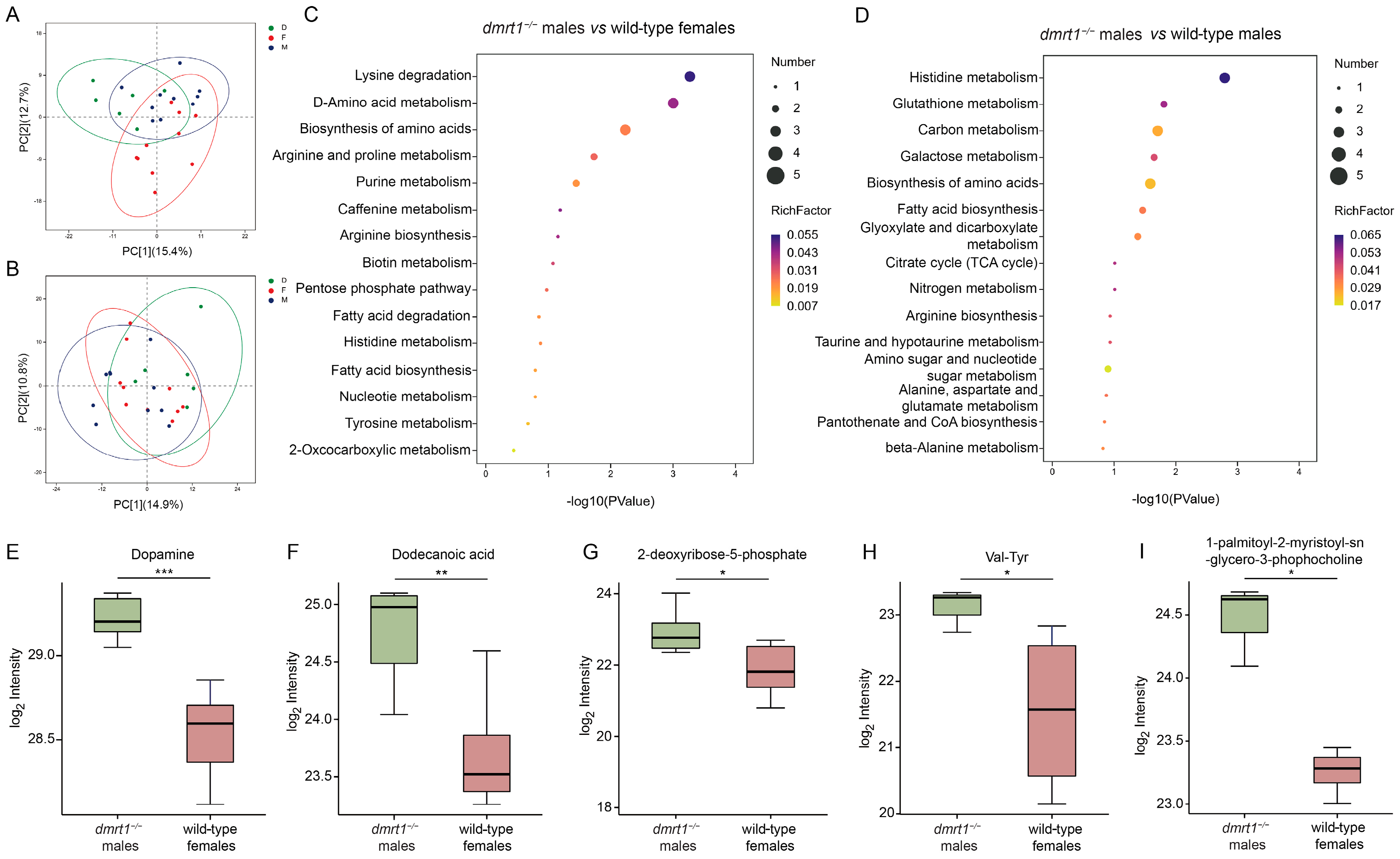 dmrt1 deficiency. Additionally, metabolites such as 2-deoxyribose-5-phosphate AMP and 1-palmitoyl-2-myristoyl-sn-glycero-3-phosphocholine indicated changes in nucleotide/energy metabolism and membrane phospholipid remodeling [