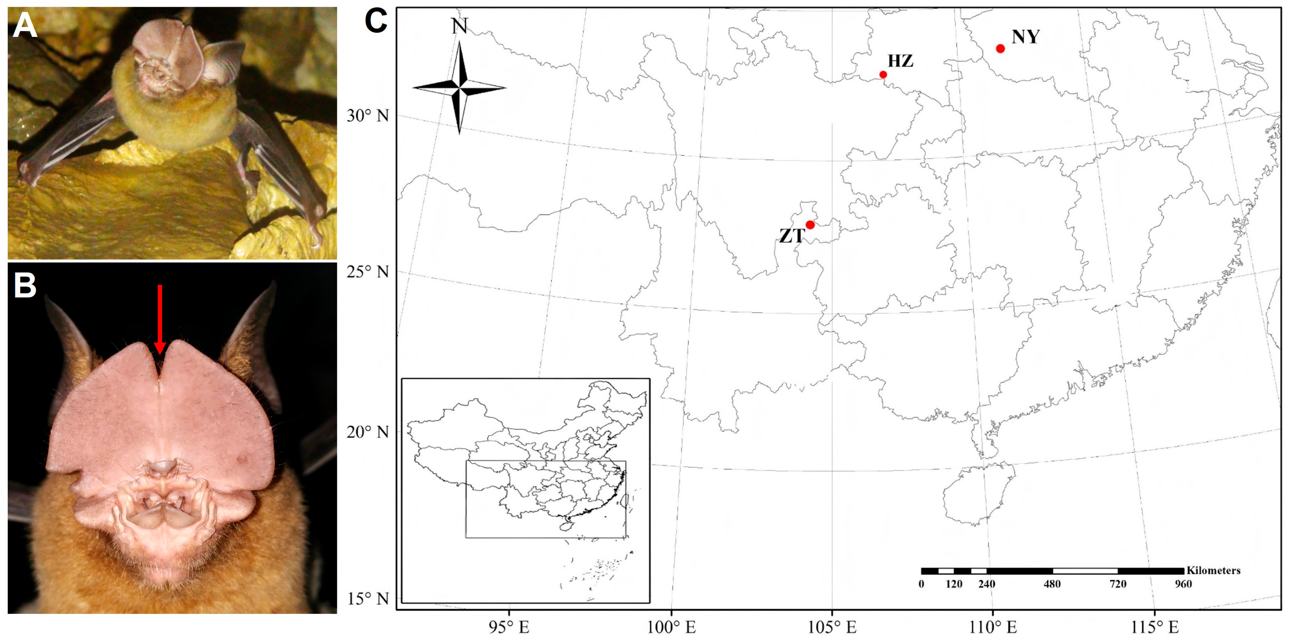 - Liu, W.; Wang, J.; Hao, Y.; Song, X.; Yang, Y.; Li, J.; He, J.; Bu, Y.; Niu, H. Molecular phylogeography of Hipposideros pratti in China. Integr. Zool. 2024, 19, 999–1003. [Google Scholar] [CrossRef] [PubMed]