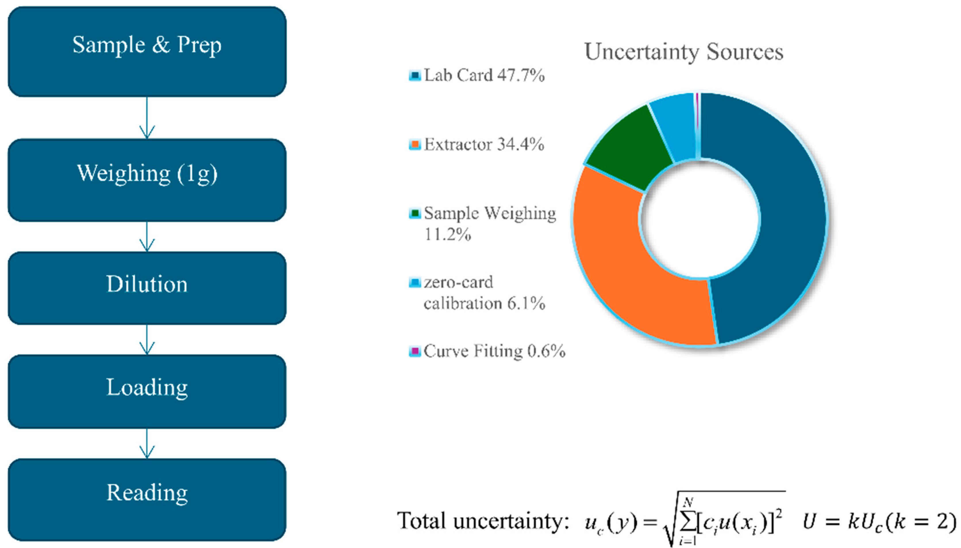The left panel outlines the seven experimental steps, while the right panel illustrates the relative contributions of the five main uncertainty sources: Lab Card (47.7%), Extractor (34.4%), Sample Weighing (11.2%), zero-card Calibration (6.1%), and Curve Fitting (0.6%). Dashed arrows highlight how each stage in the experimental workflow connects to its associated source of uncertainty. Together, these combined sources measure the expanded uncertainty, which is expressed as , .